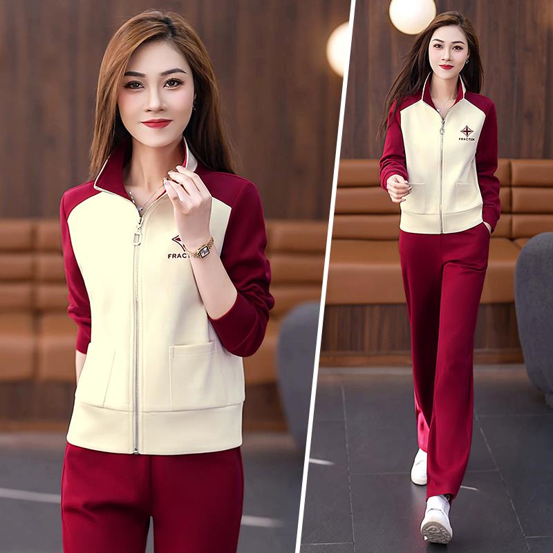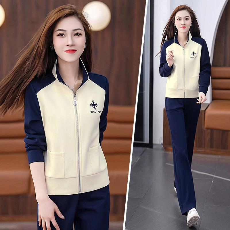 领拼接撞色立8417128运动休闲套服装春秋季新女款宽松直筒裤两件