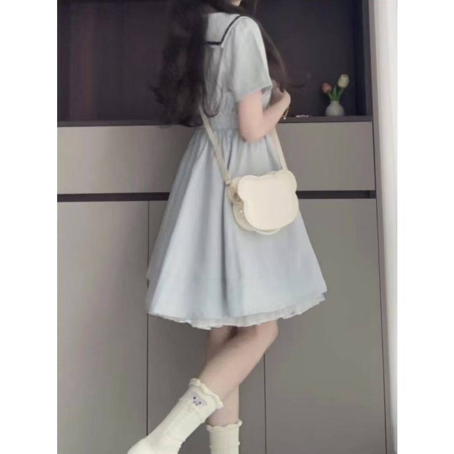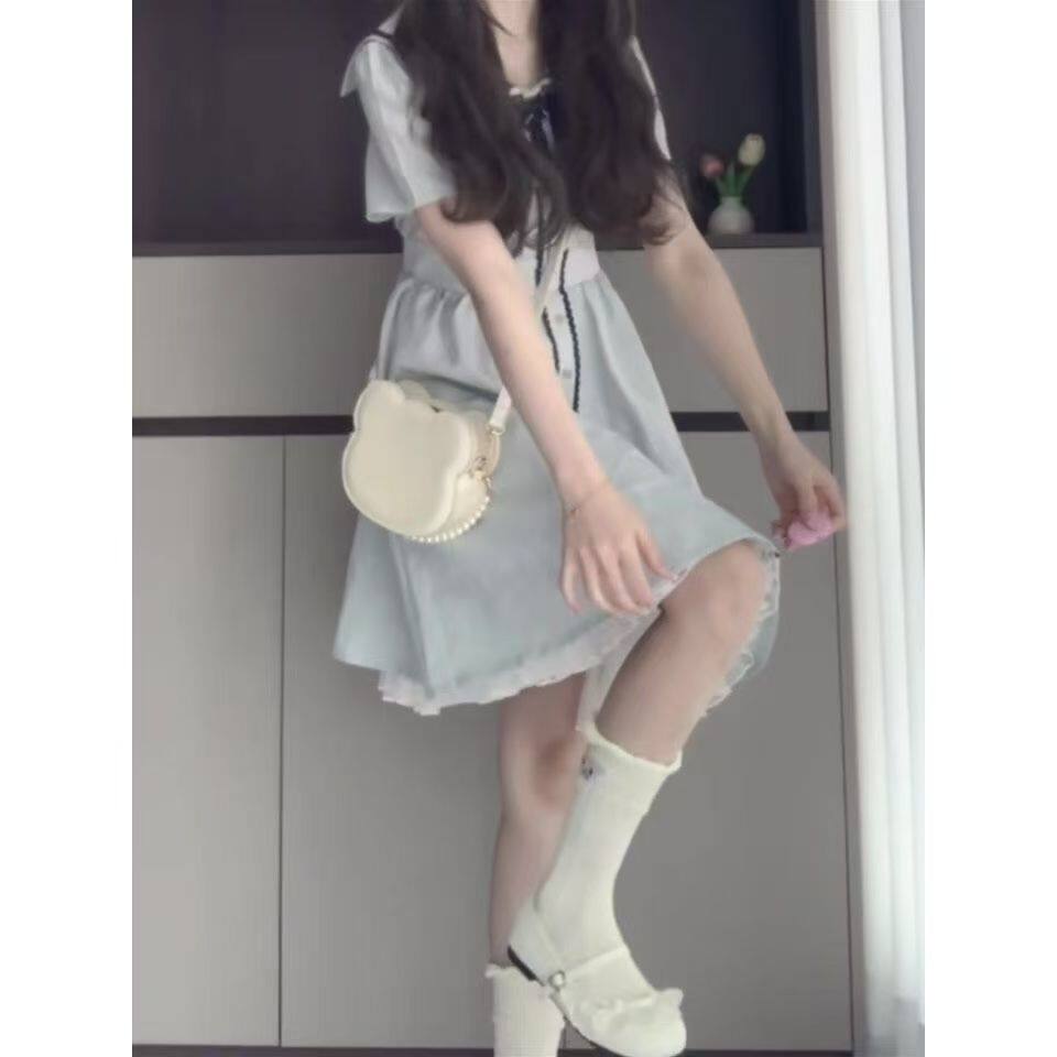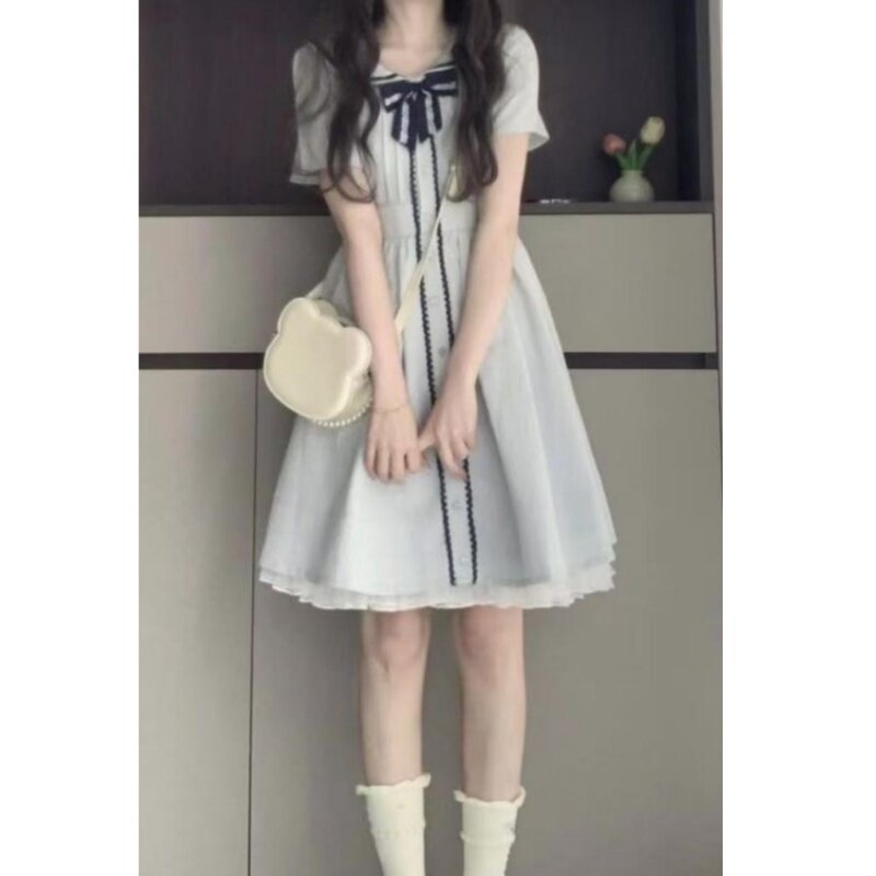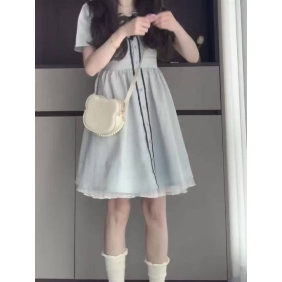 女大童法式连衣裙夏季2025新款初中高中生蕾丝拼接泡泡袖甜美裙子