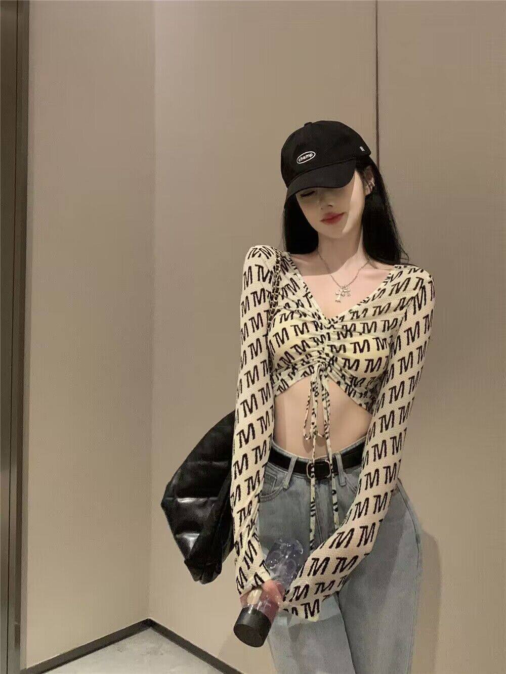 辣妹白色v领长袖T恤女装秋季短款性感别致修身紧身打底衫露脐上衣