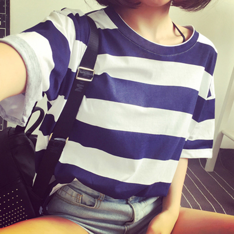 秋季新款学生韩版简约条纹短袖t恤女士宽松衣服上衣学生打底体恤