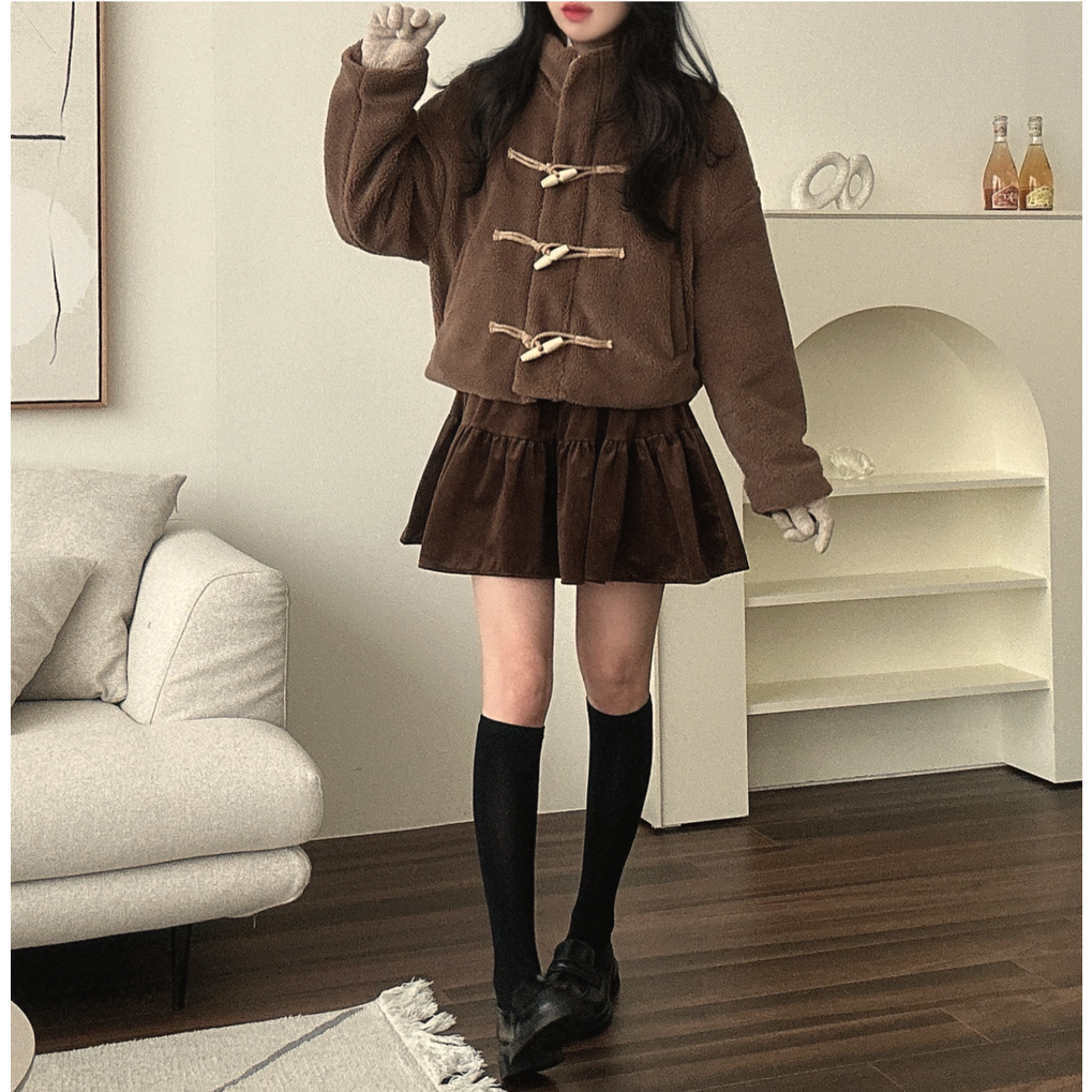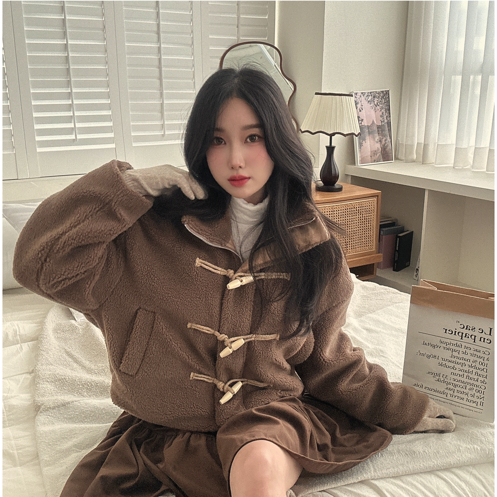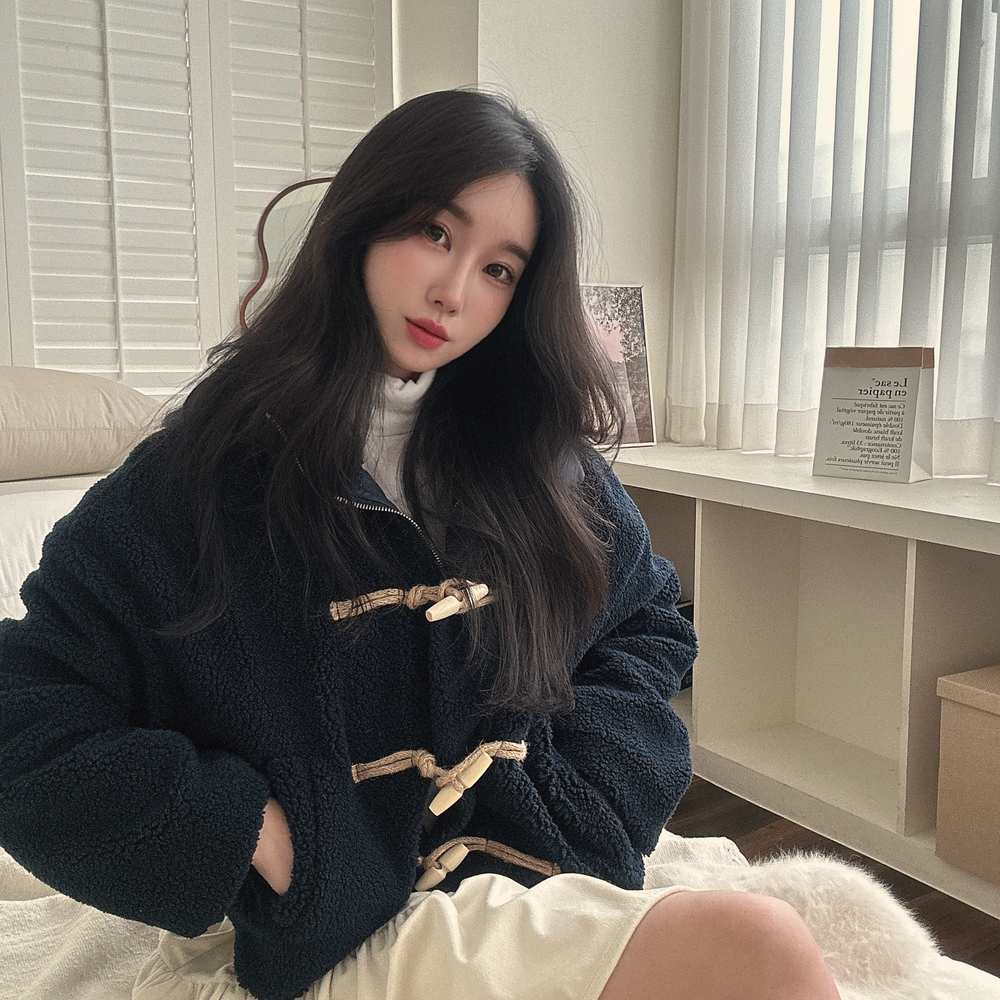 韩国chic 复古小个子慵懒风立领羊羔毛牛角扣夹棉保暖外套