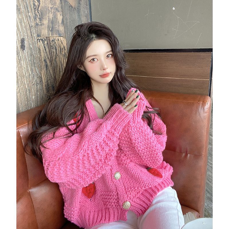 韩系温柔粉色毛衣开衫女春秋季甜美草莓针织加厚外套V领短款上衣
