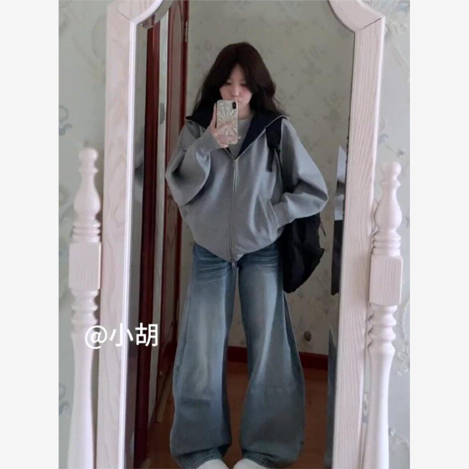 韩系连帽长袖撞色卫衣女2025秋季新款宽松灰色设计感拉炼外套上衣