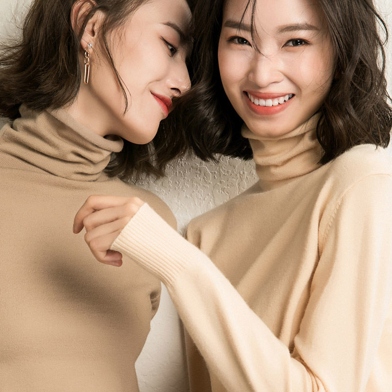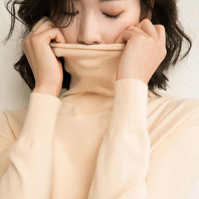 羊毛混纺2024秋冬女装新款韩版修身显瘦高领纯色堆堆领针织打底衫
