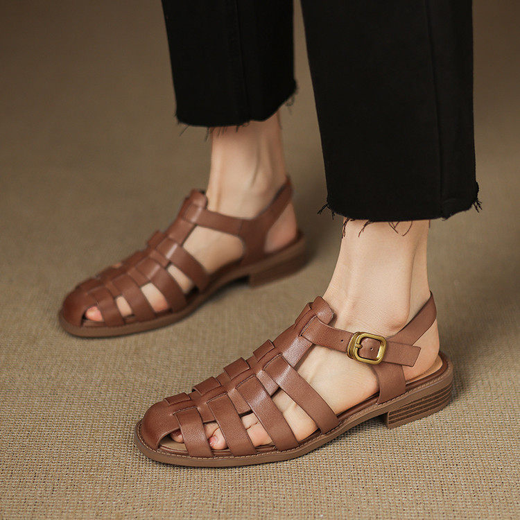 真皮编织罗马凉鞋女半包头后空夏时尚复古镂空透气T带平底丁字鞋~