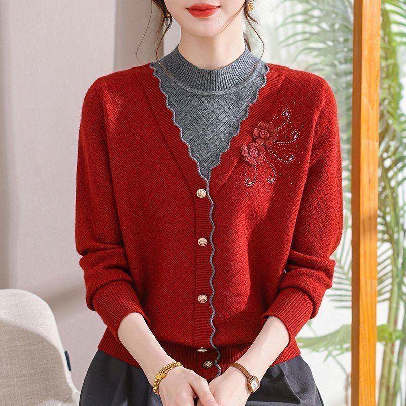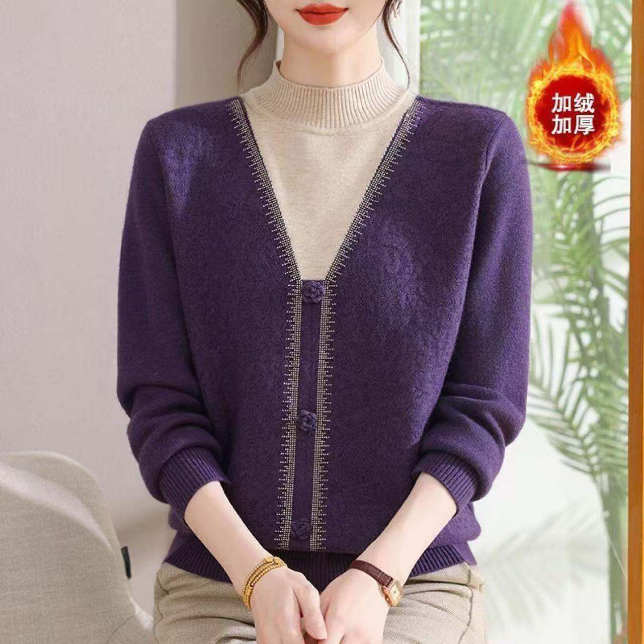 2025新款毛衣女加绒假两件针织衫时尚百搭冬季上衣羊毛衫洋气打底