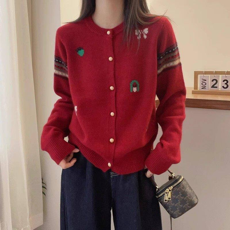 春装红色毛衣外套女2025本命年蛇年新中式国风针织开 衫耶诞节新