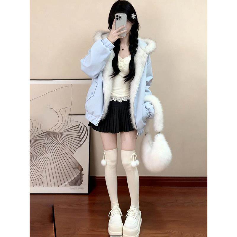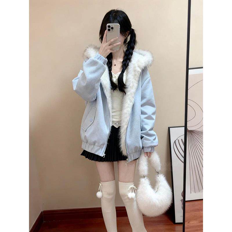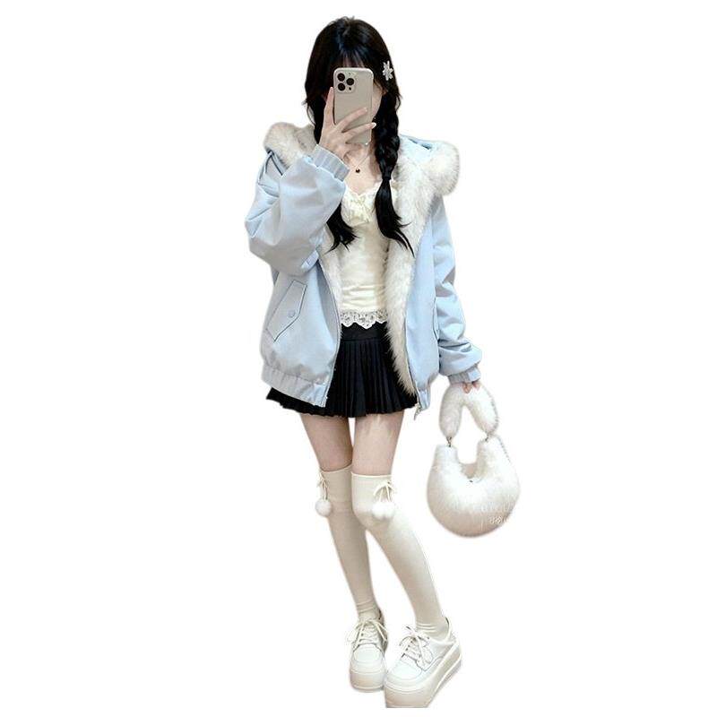 可爱少女蓝色猫耳朵毛领连帽双面可穿棉服女冬季新款宽松保暖外套