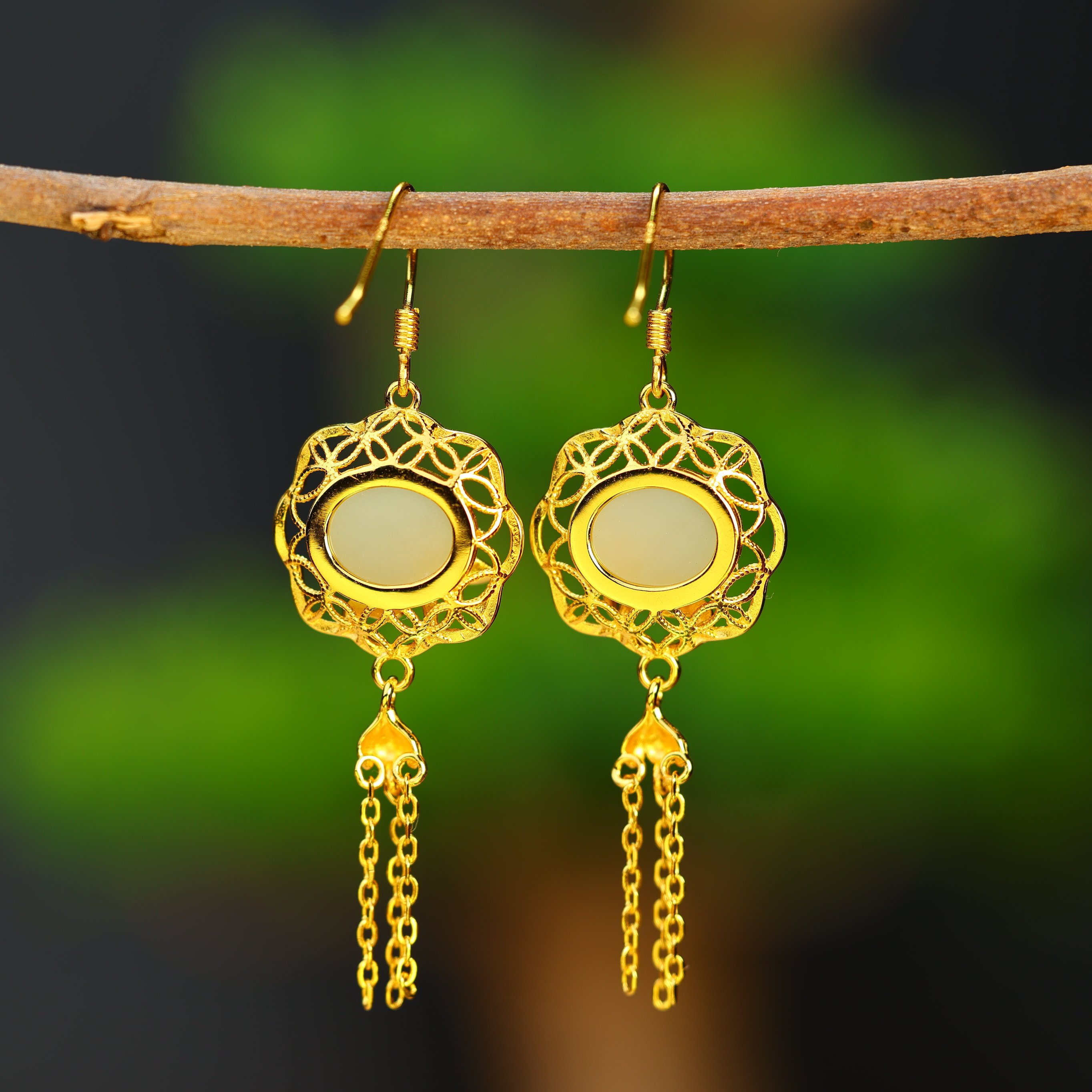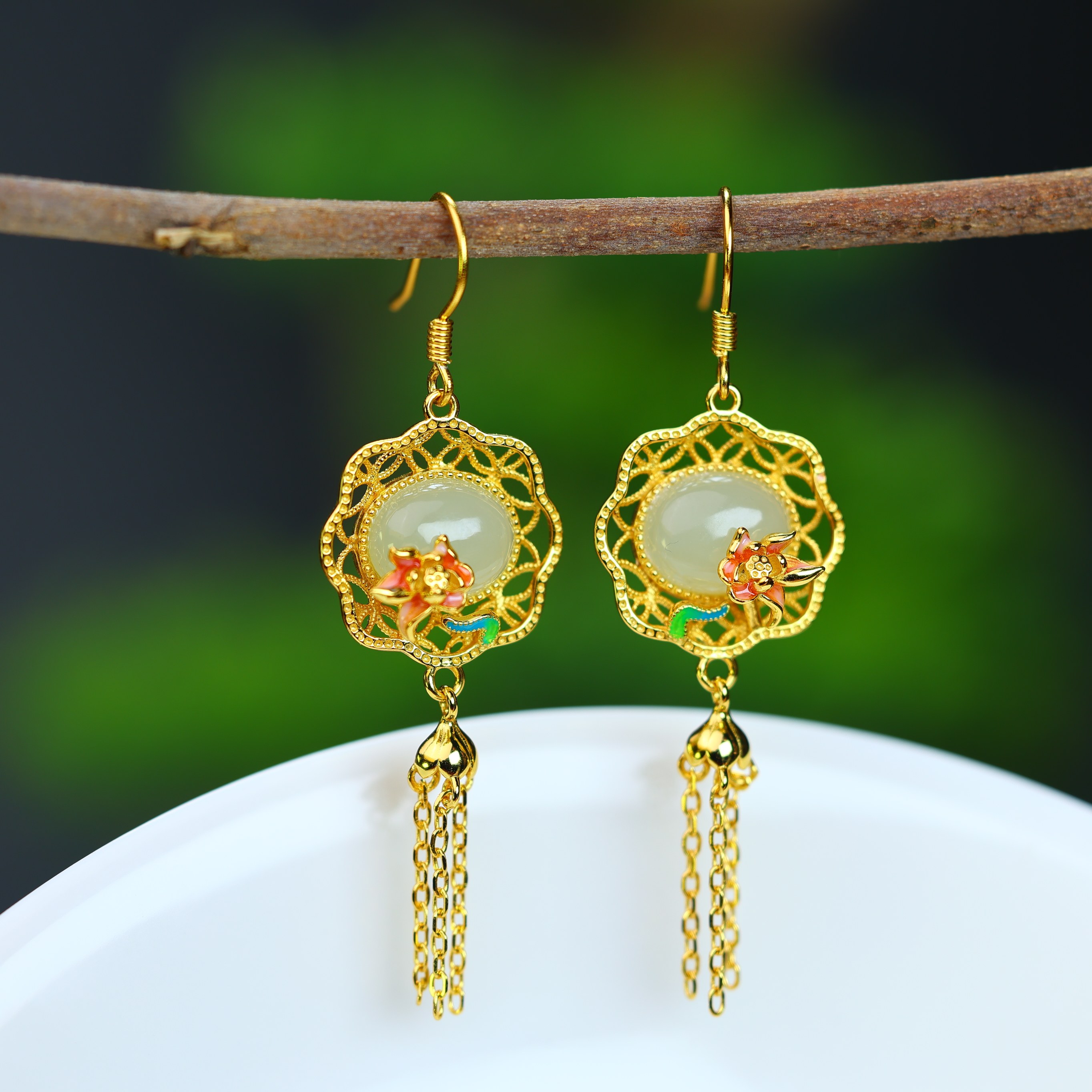 首页> 配饰> 天然和田玉白玉925银镶嵌蛋面珐琅流苏玉石古法金耳环耳坠