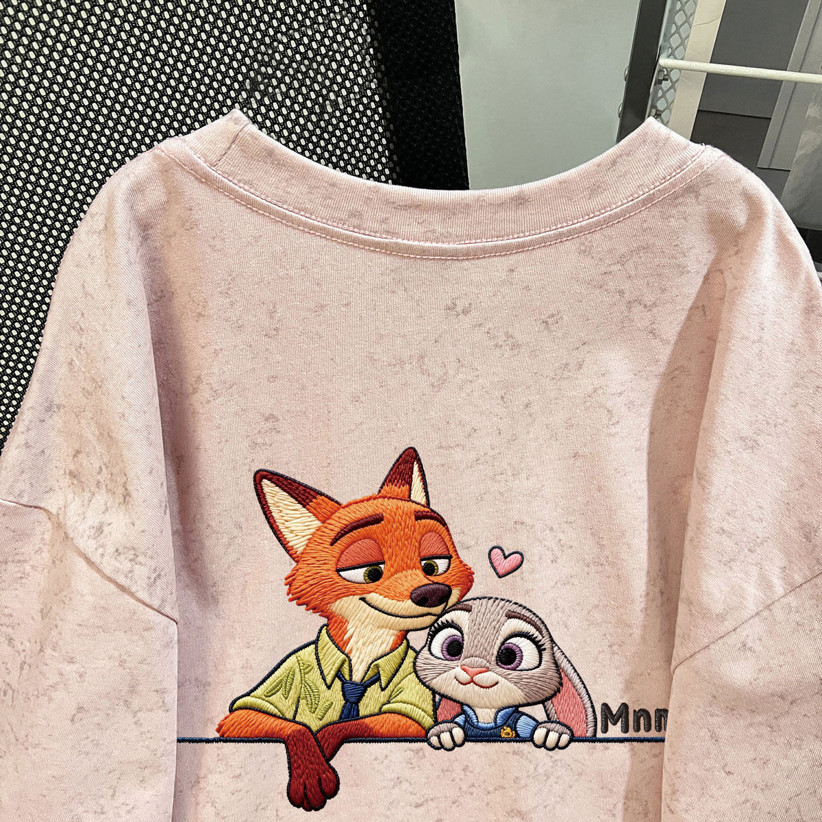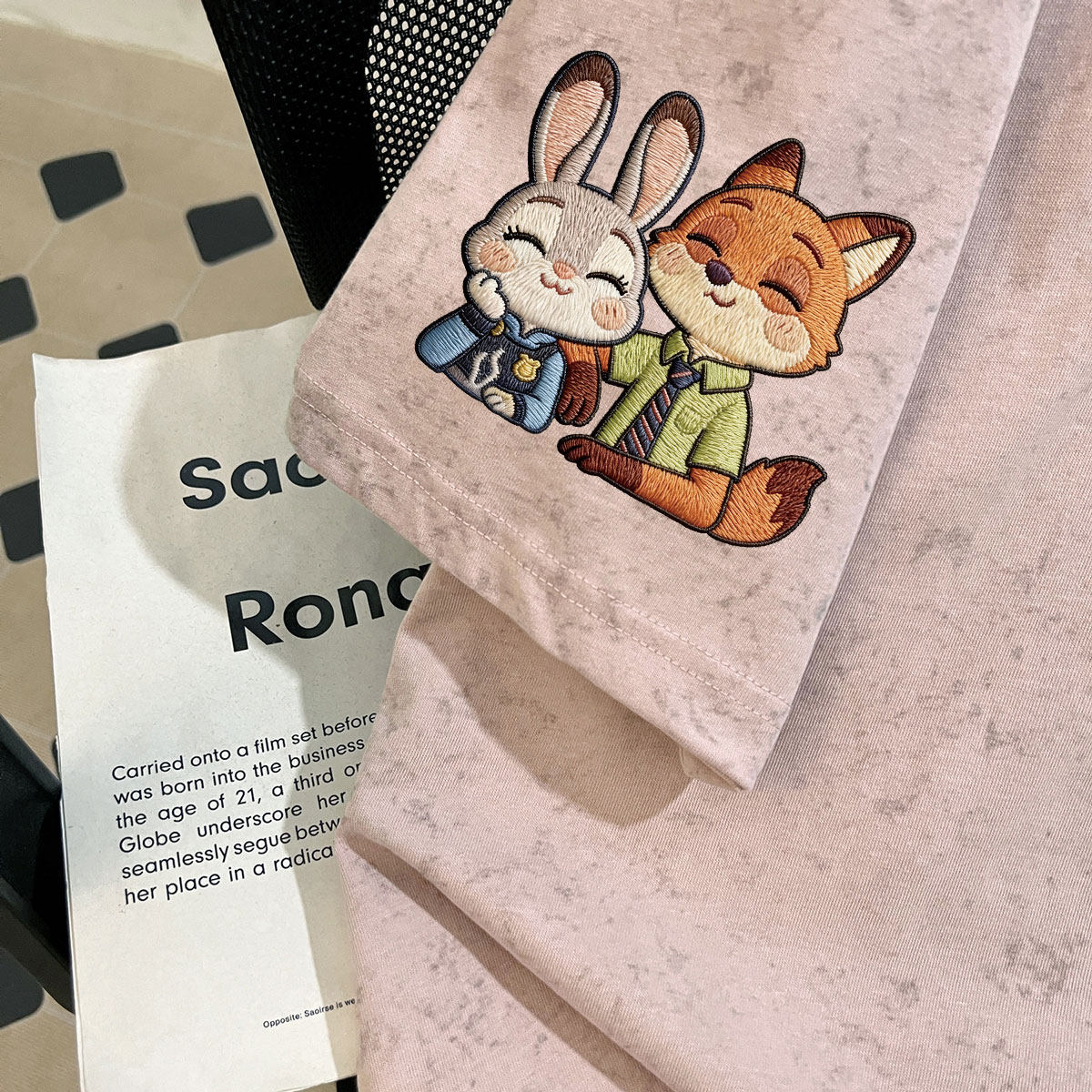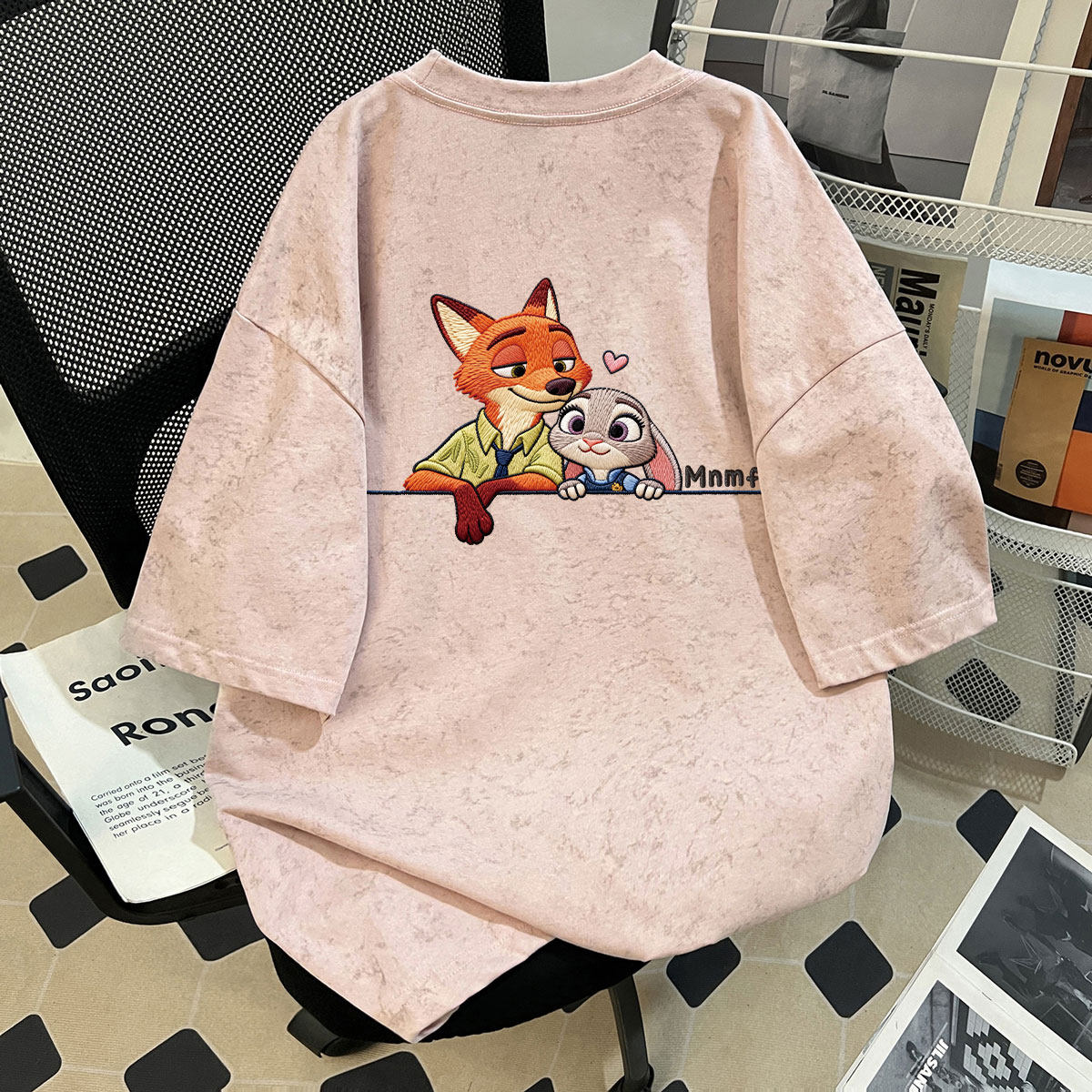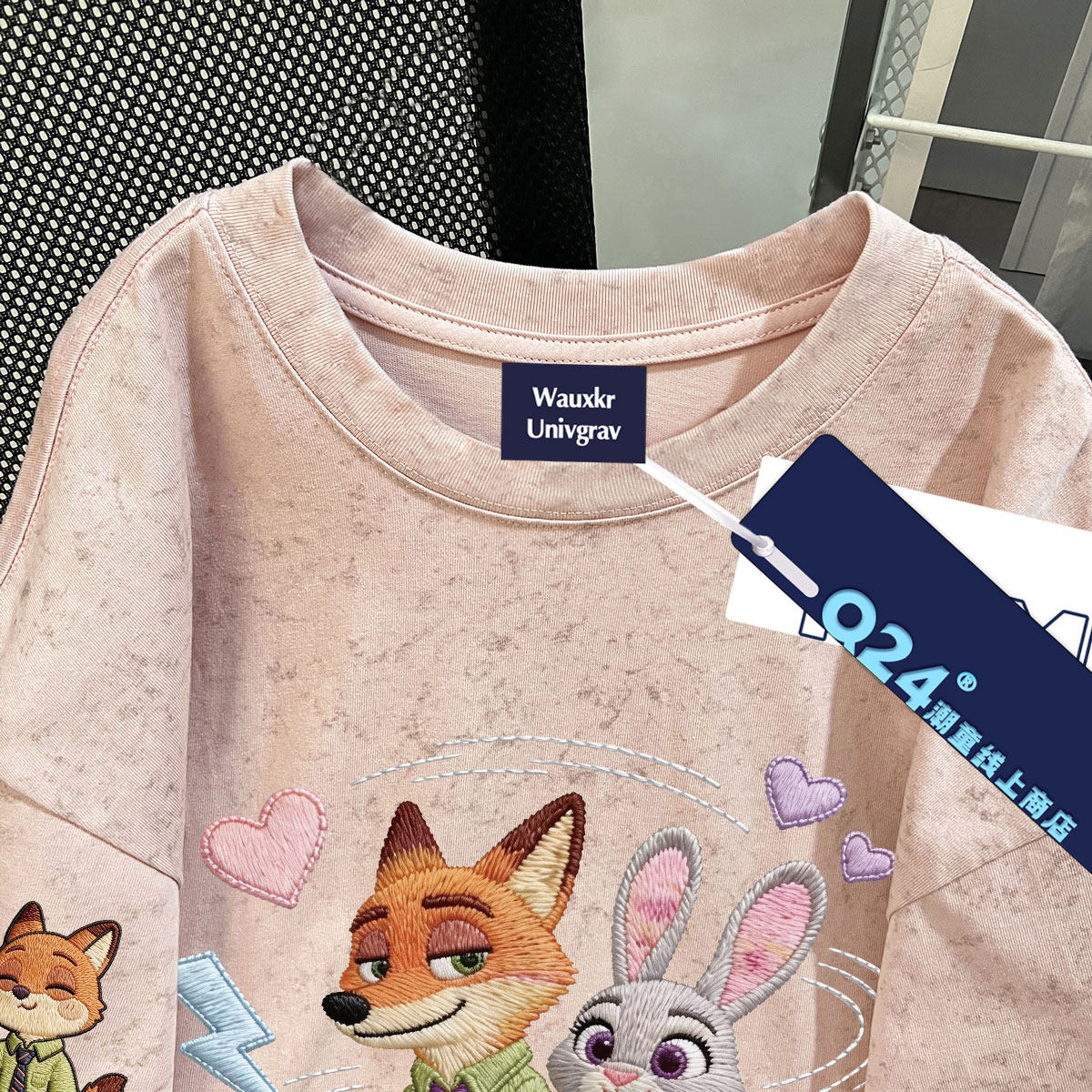 100%纯棉疯狂动物城仿刺绣扎染短袖夏季款百搭休闲初中生上衣ins