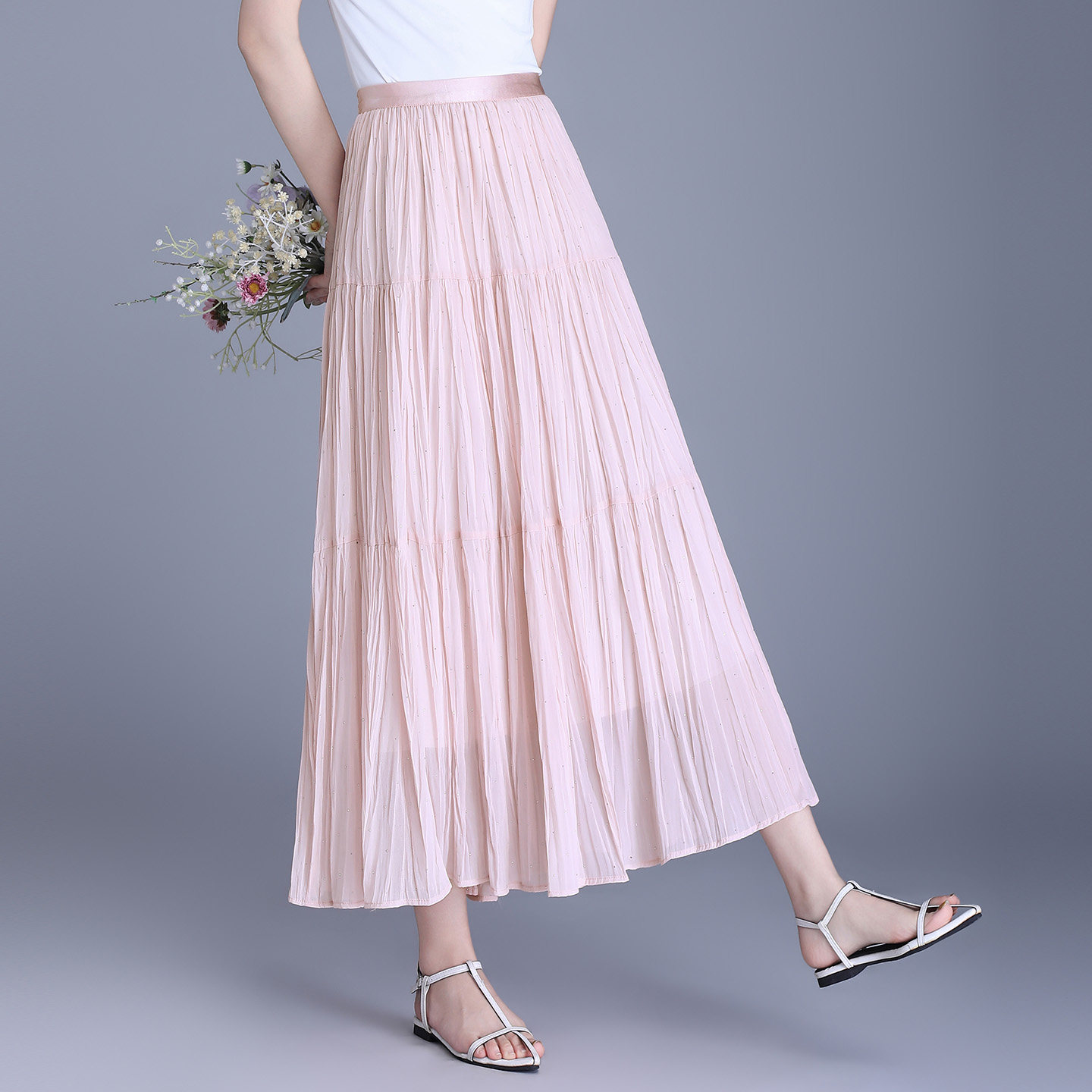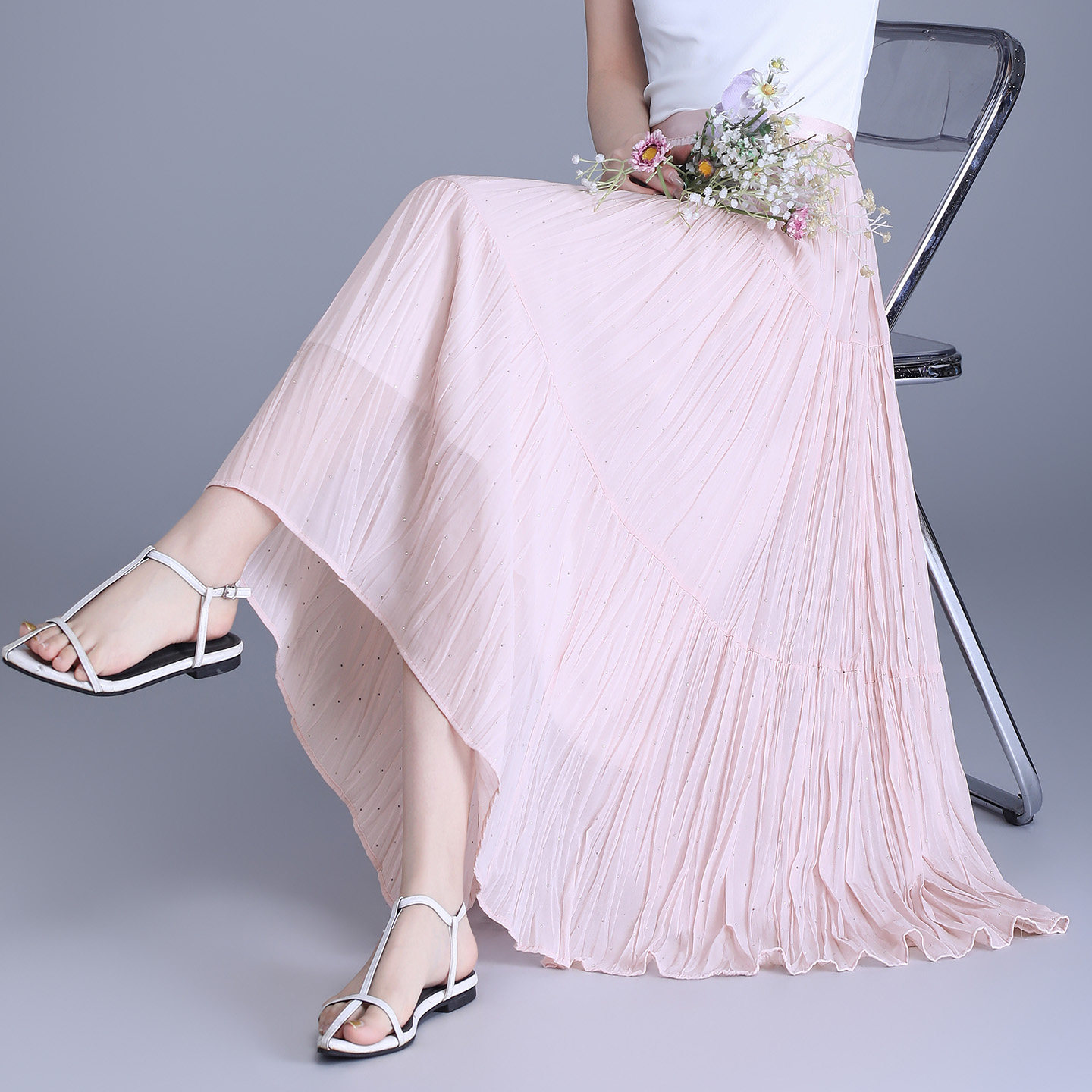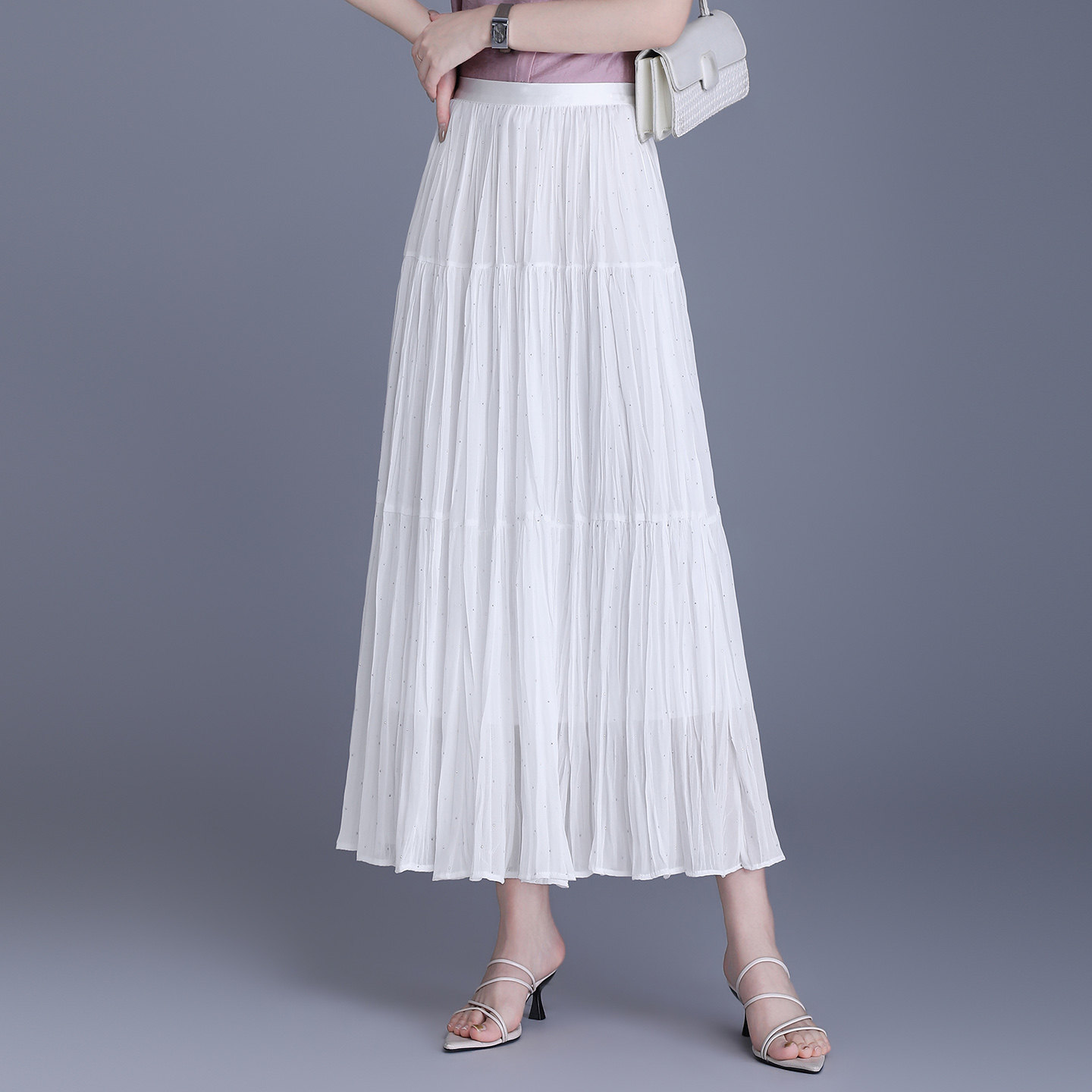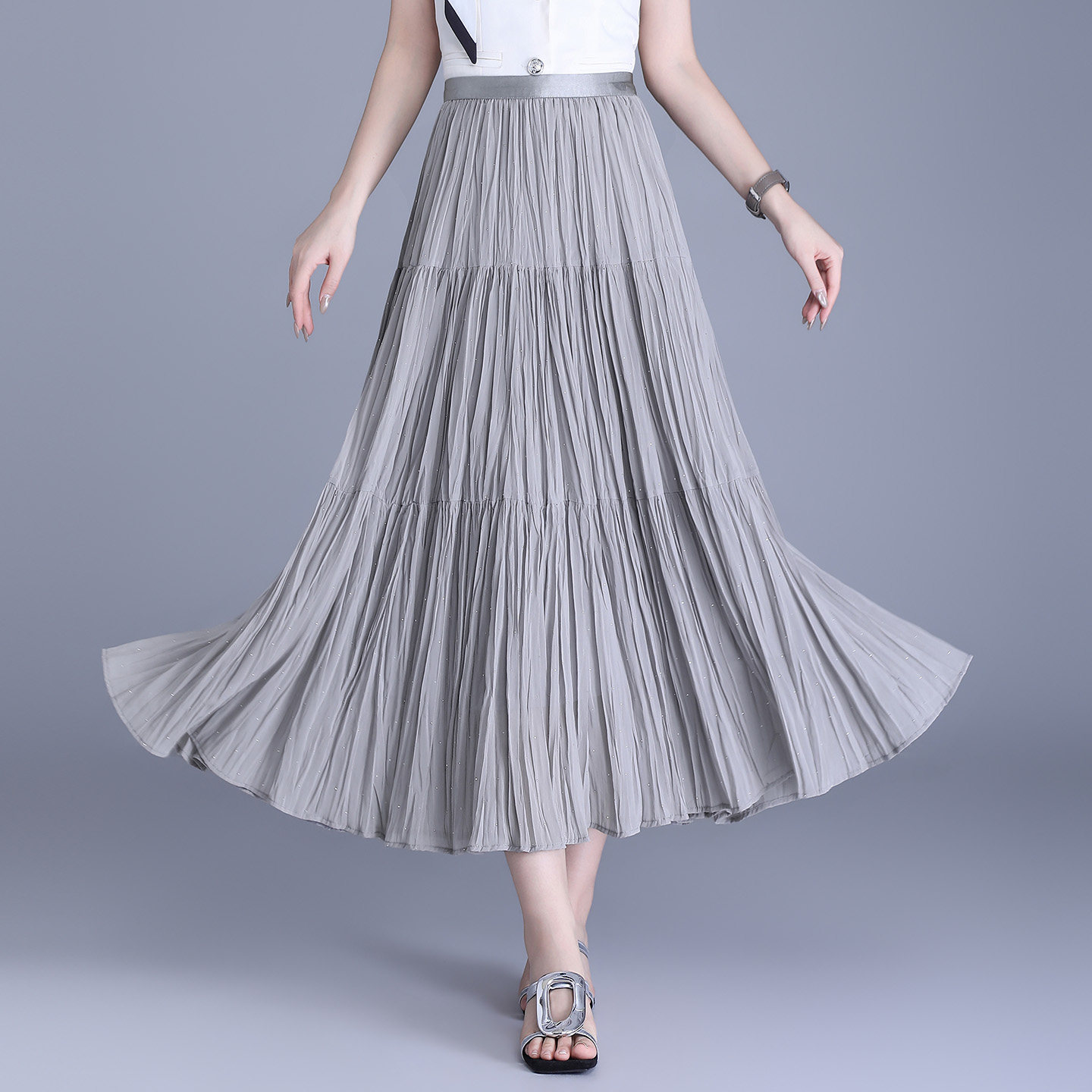 首页> 女装> 垂感烫钻雪纺百褶半身裙女2026春夏百搭遮胯显瘦中长款a字大摆裙