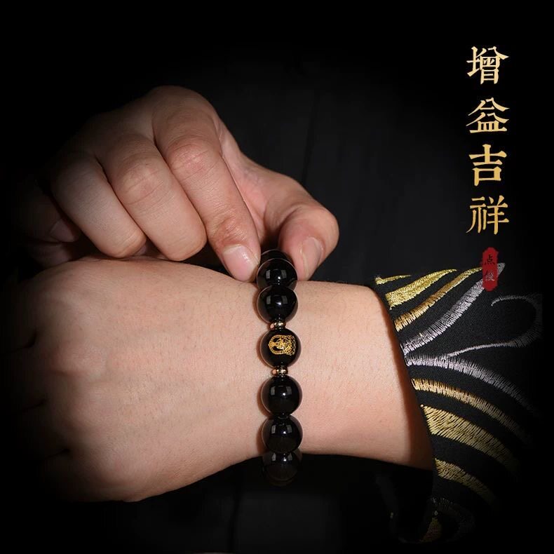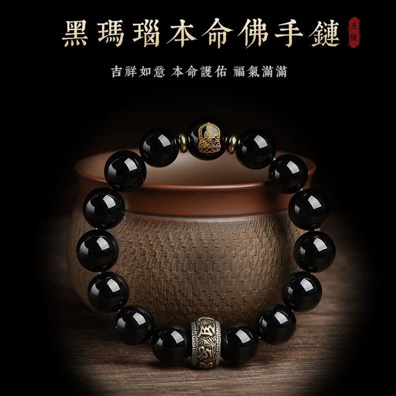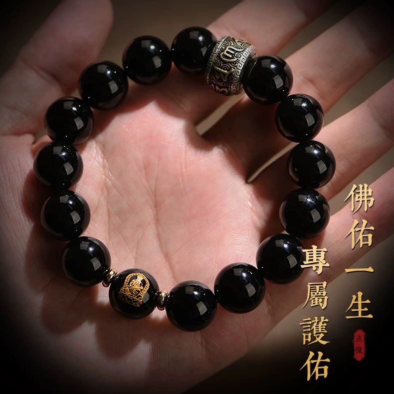天然黑玛瑙手链六字真言梵文佛珠手串本命年缺水补水黑