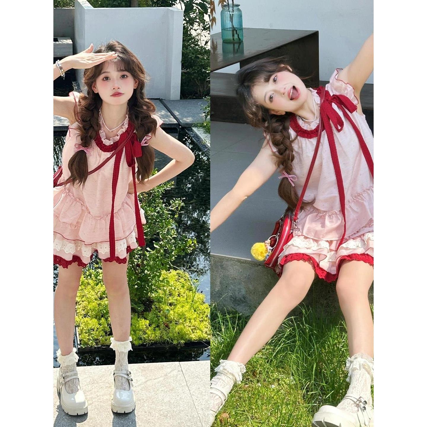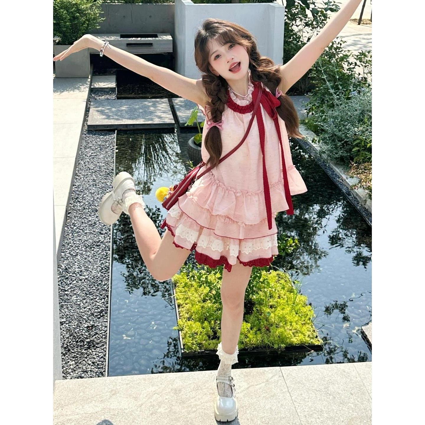 法式小飞袖粉色连衣裙子女夏季2025新爆款小个子蛋糕短裙两件套装
