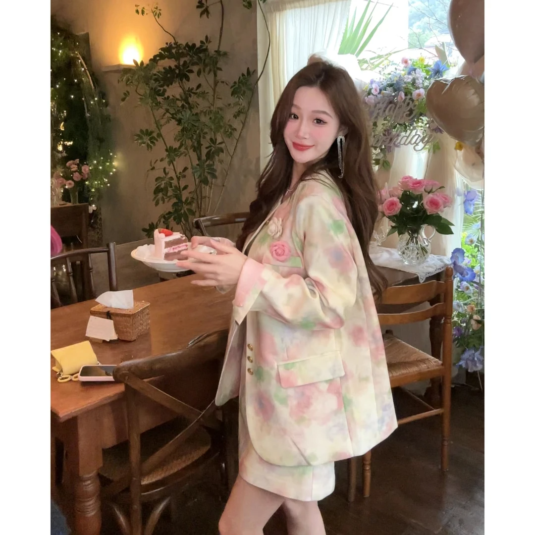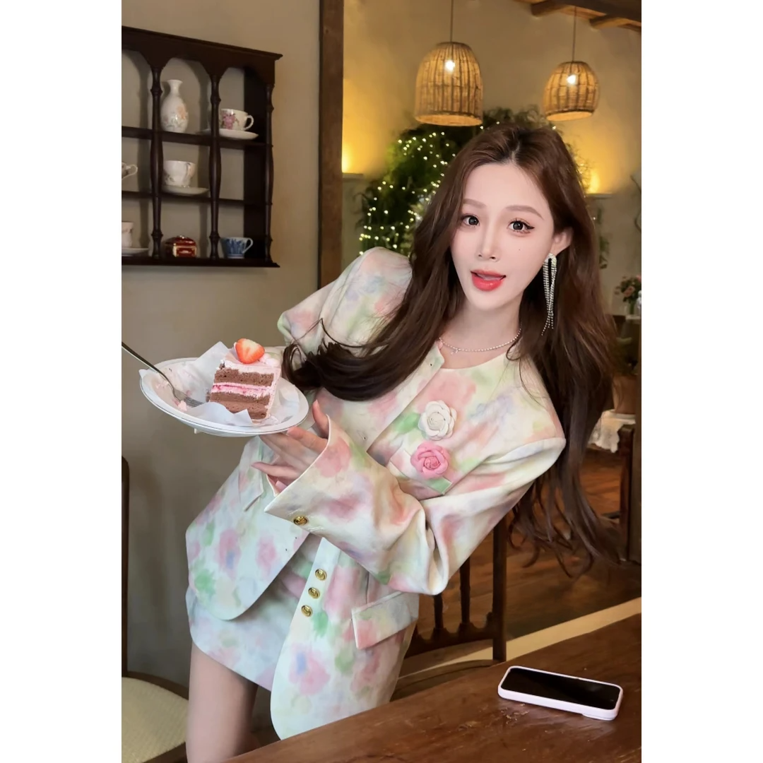 2025早春新款晕染印花西装外套半裙套装女名媛气质宽松百搭两件套