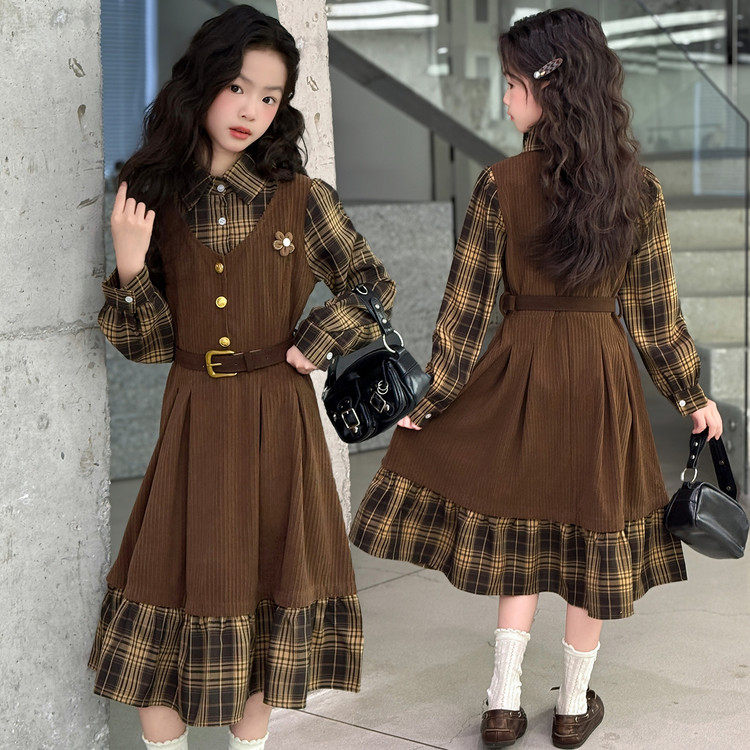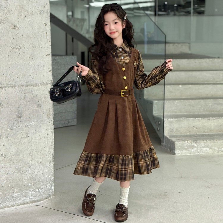女童复古学院风假两件连衣裙春秋格子拼接中长裙时髦气质