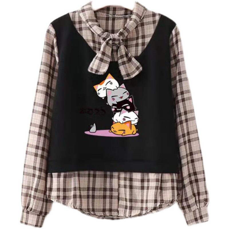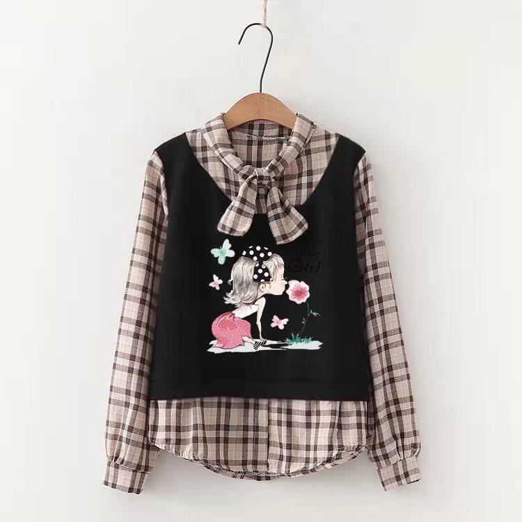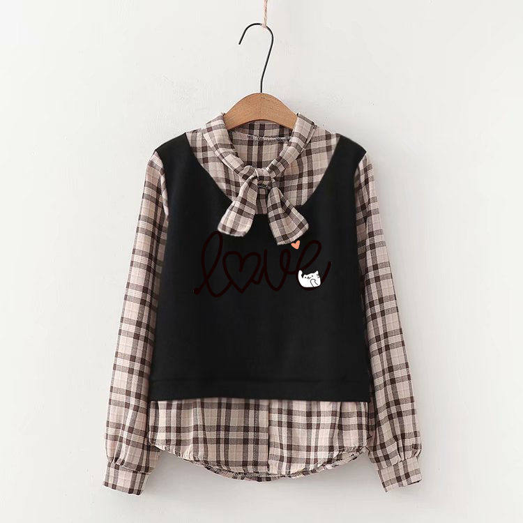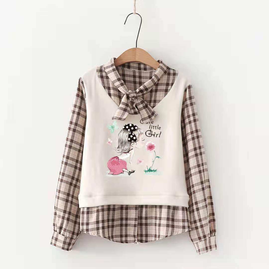 棉高中生假两件衬衫秋装宽松初中生格子学院风衬衣甜美新款少女装