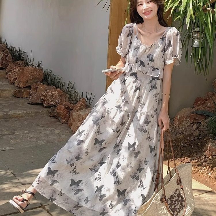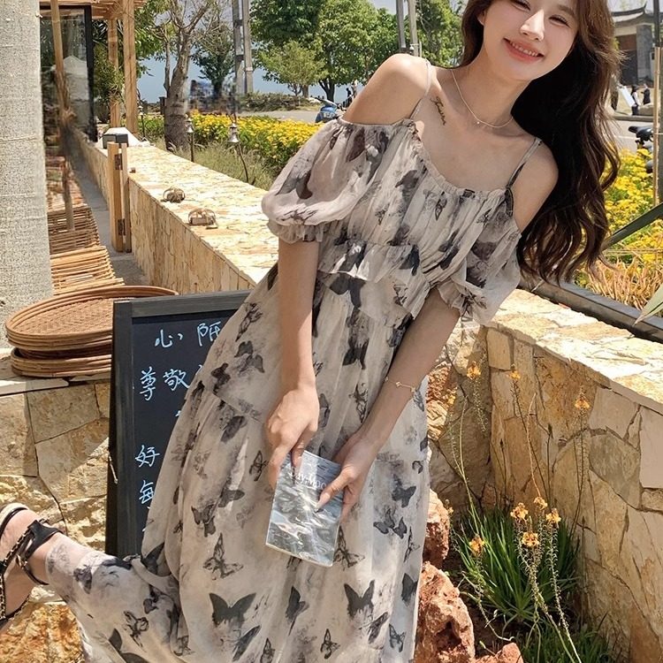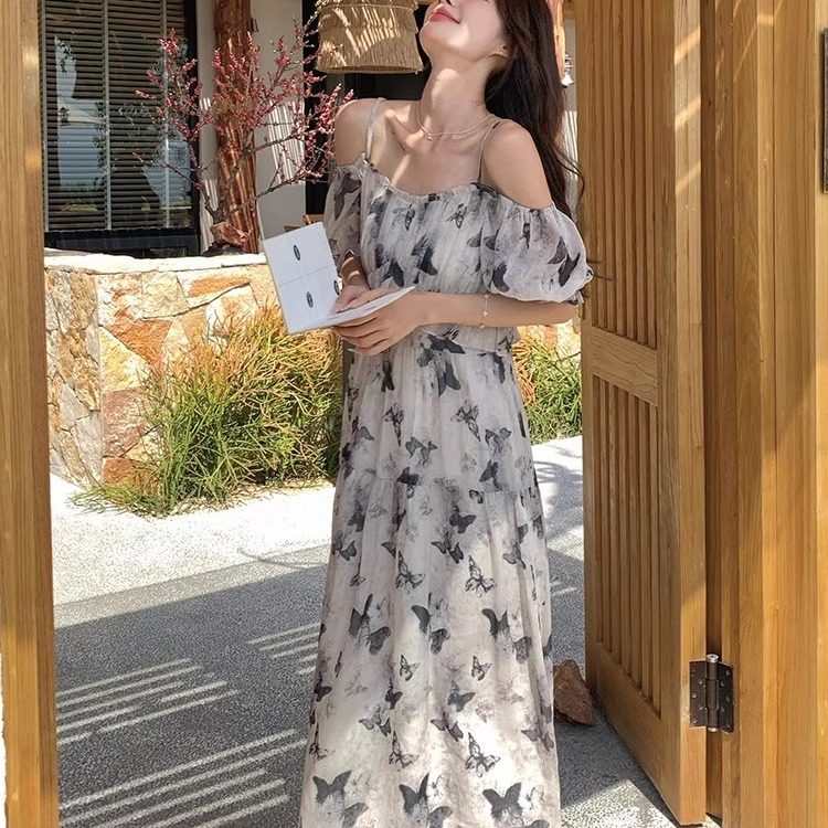 绝美一字肩连衣裙女夏2025新款海边度假穿搭露肩碎花雪纺吊带长裙