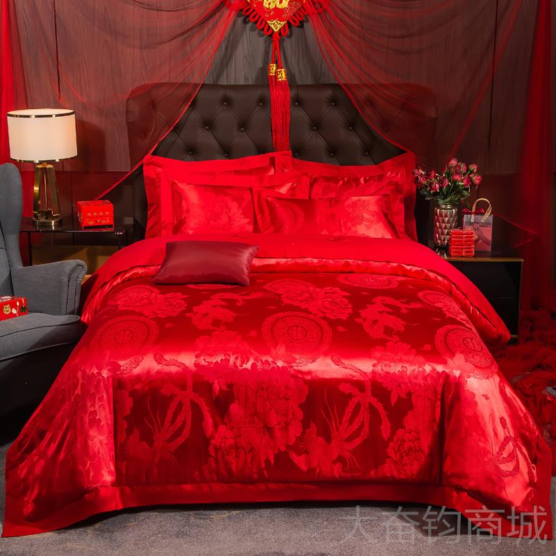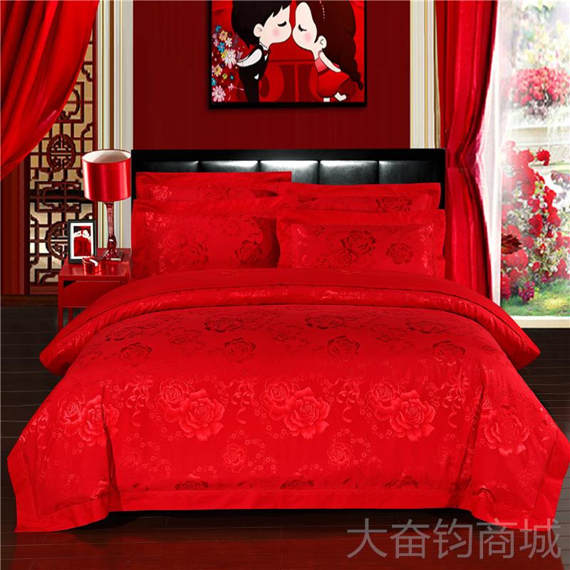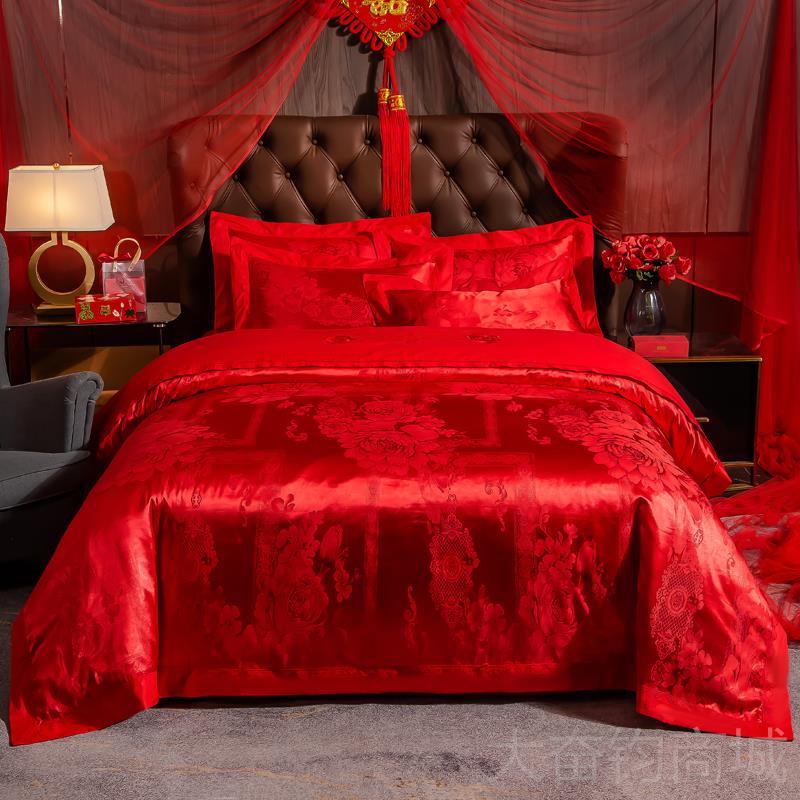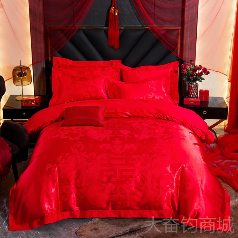正品喜嫁整床上品大红色结婚四件套纯棉贡提缎花用婚庆床单被套床