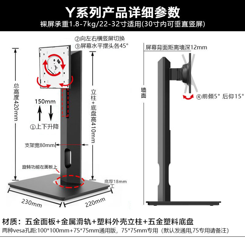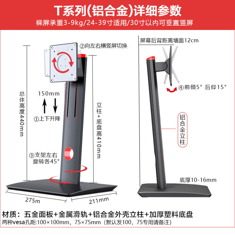 电脑显示器支架底座升降旋转24/27/32寸屏幕通用竖屏vesa增高支架