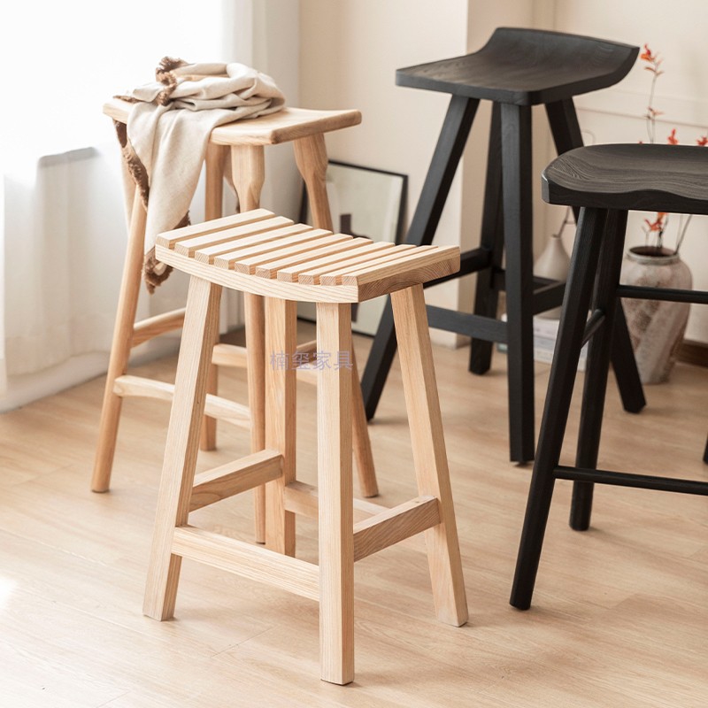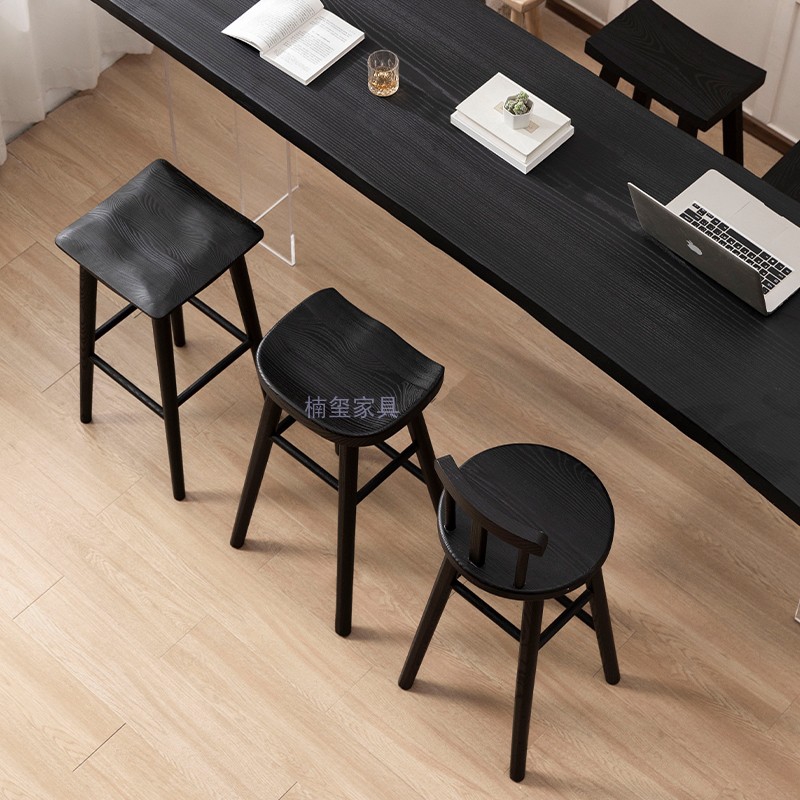 侘寂风黑色实木吧台椅轻奢家用白蜡木高脚凳吧台凳原木靠背休闲椅