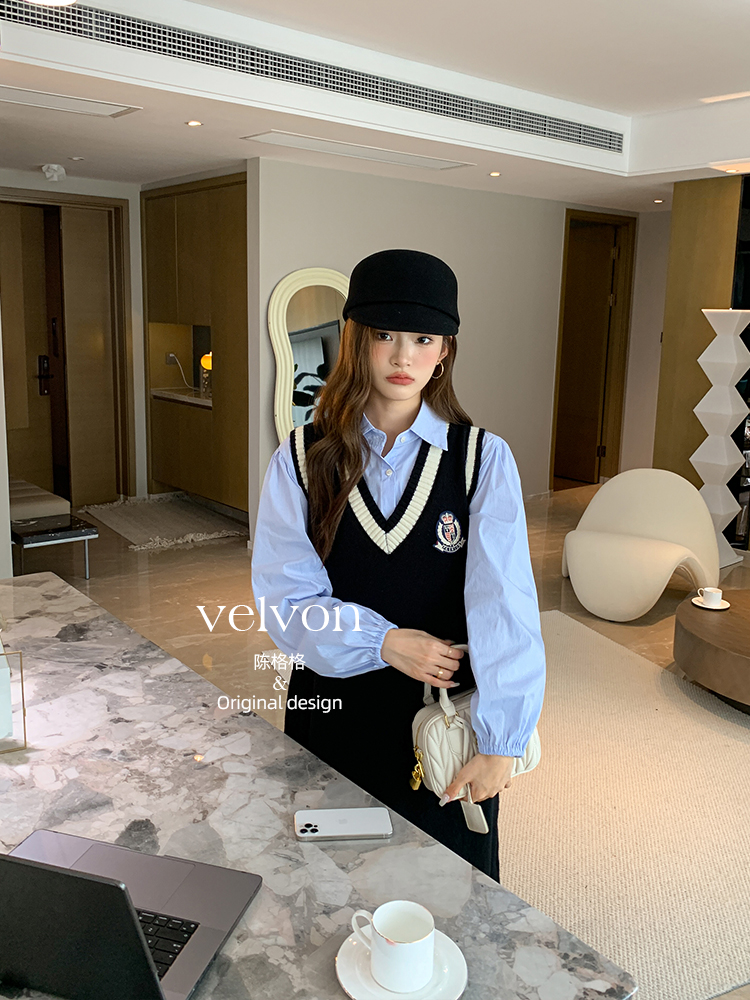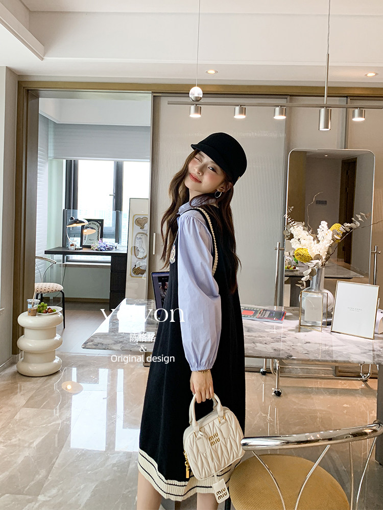 【陈格格】英伦学院大小姐~V领中长款复古减龄针织毛衣背心连衣裙
