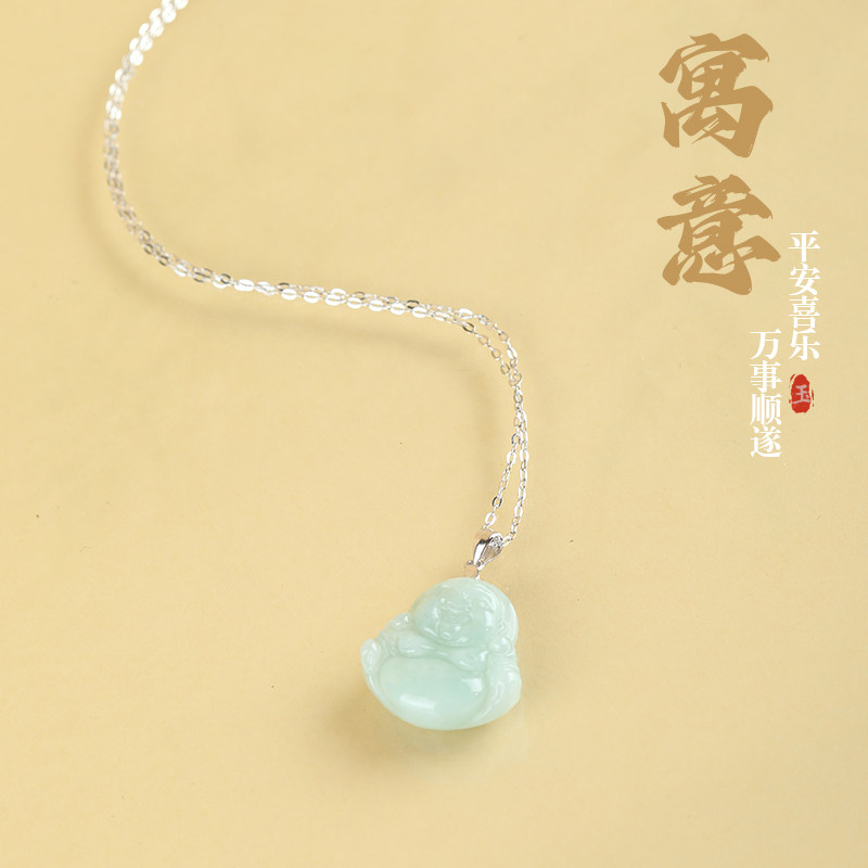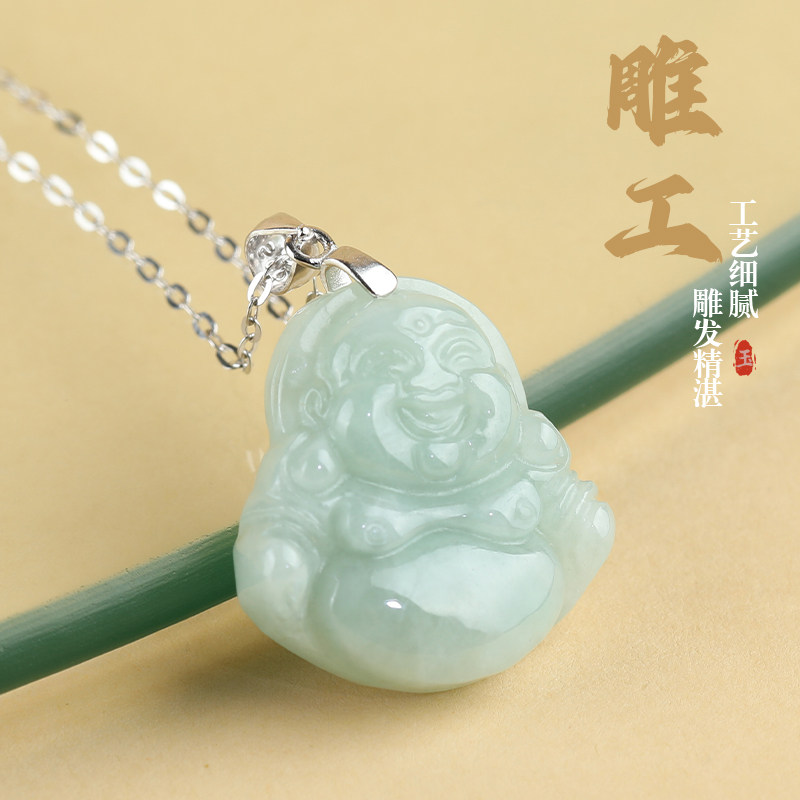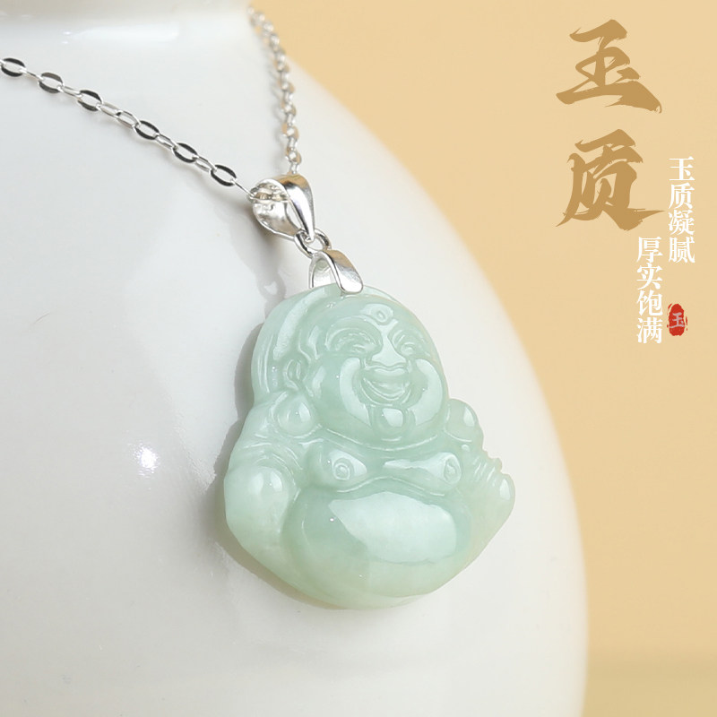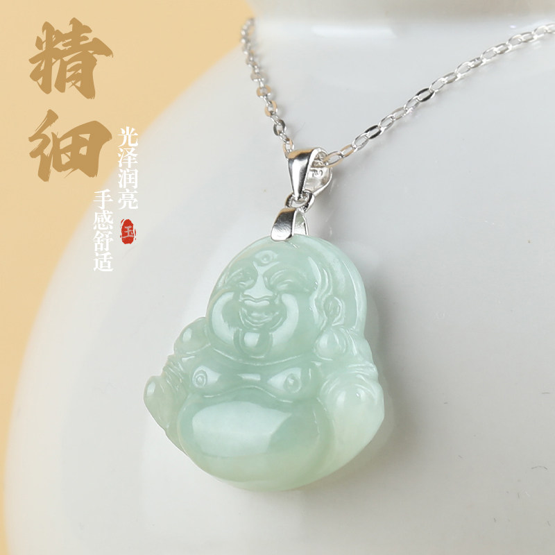 唐今玉天然缅甸a货翡翠浅绿小佛公笑佛吊坠S925银项链冰种玉石挂