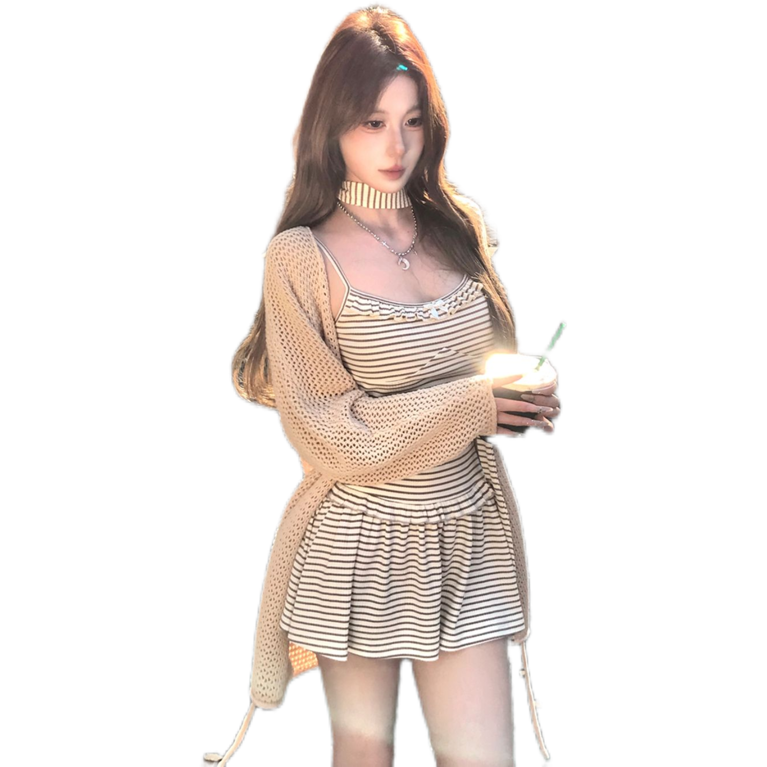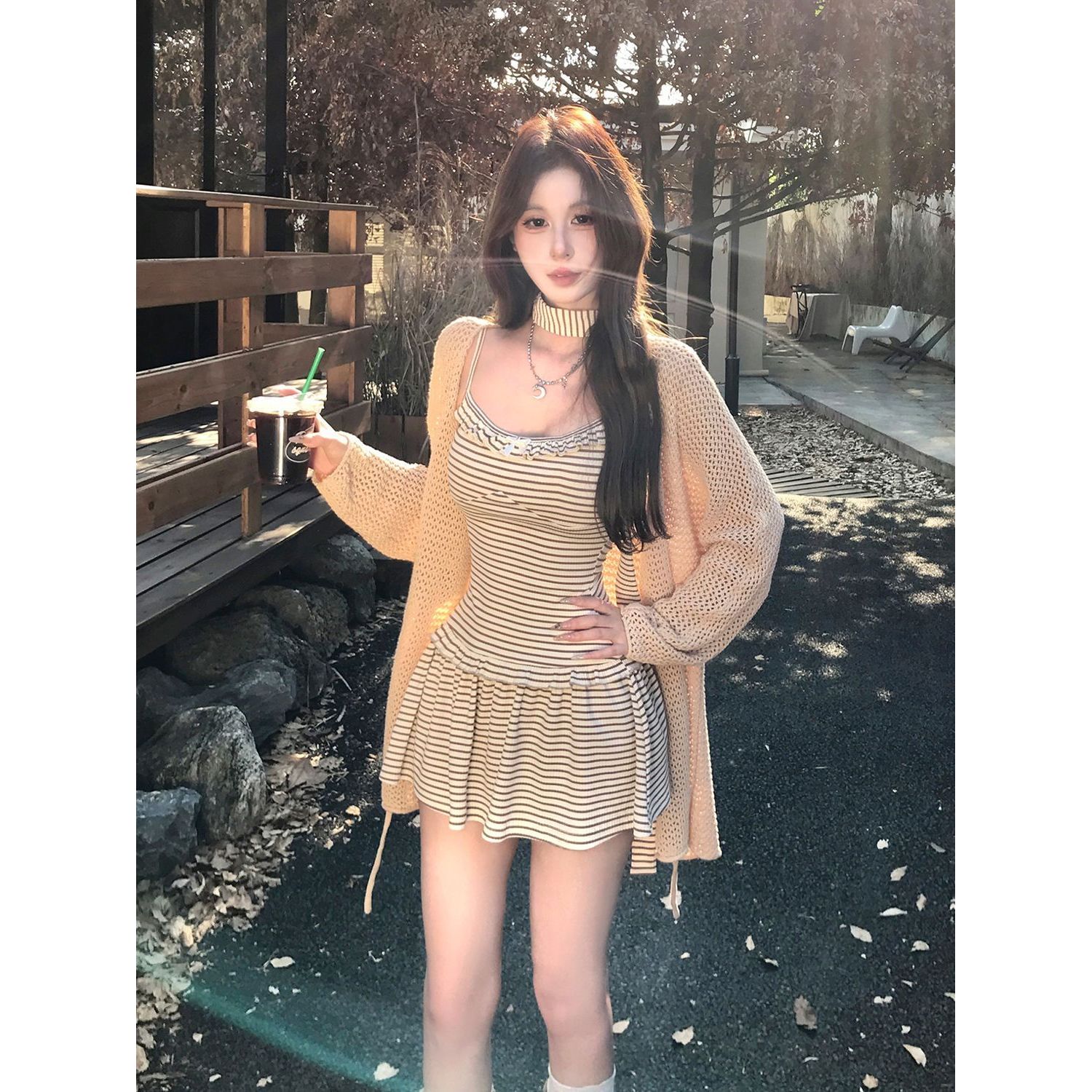 香谢轻语 纯欲性感吊带设计感收腰连衣裙+杏色毛织开衫女秋季新款
