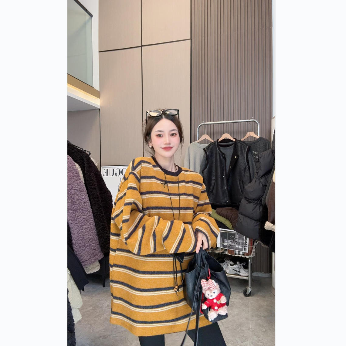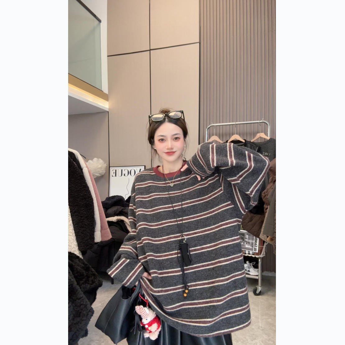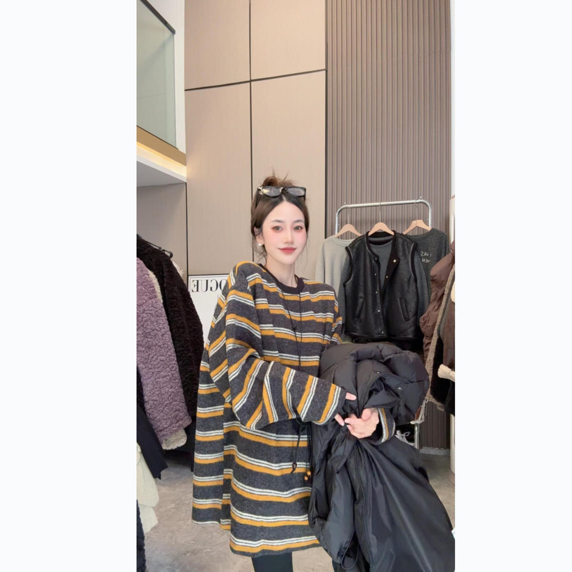 首页> 女装> 【画报女主】秋冬上新~加厚撞色条纹时尚休闲简约中长款打底上衣