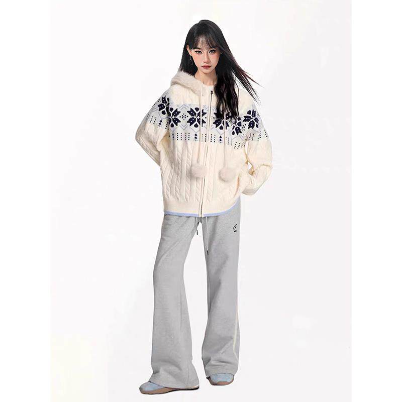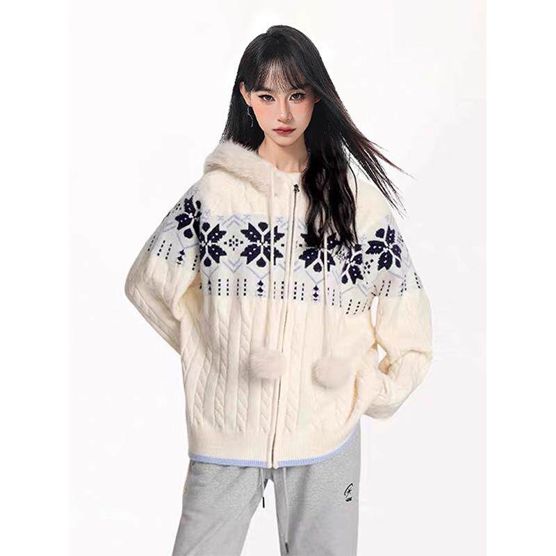 费尔岛麻花连帽毛衣外套女秋冬季2025新款慵懒风加厚提花针织开衫