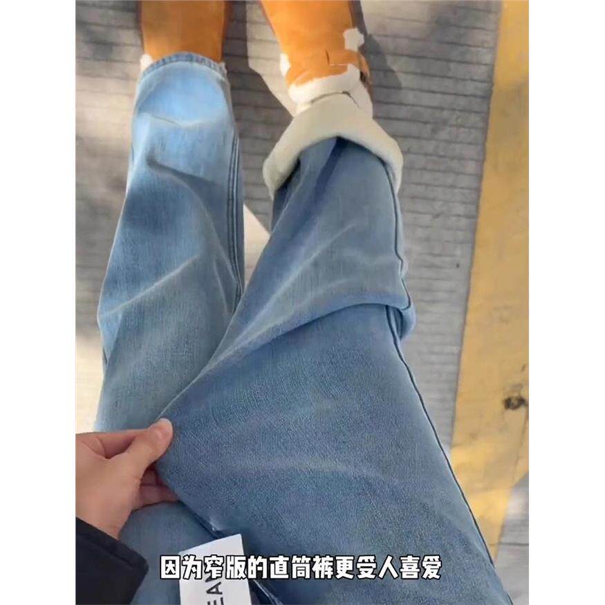加绒加厚蓝色窄版直筒牛仔裤女春秋冬微胖梨形小个子显瘦阔腿裤子