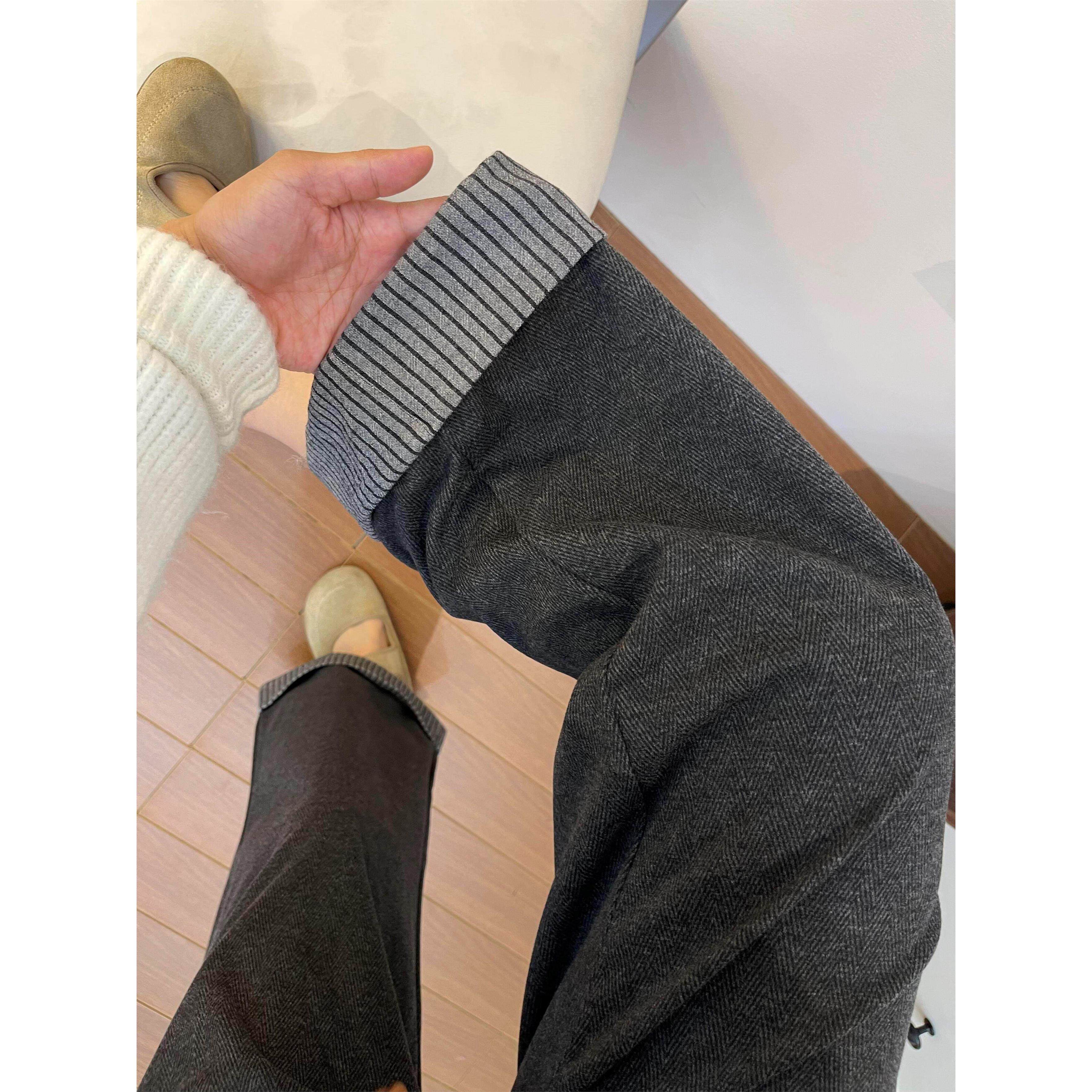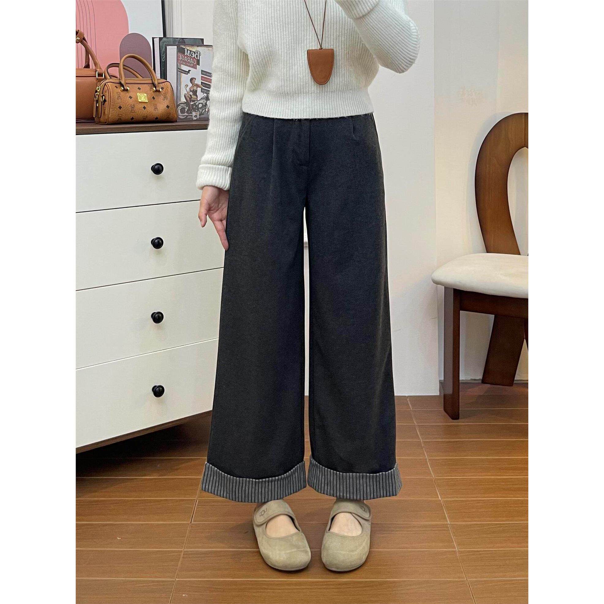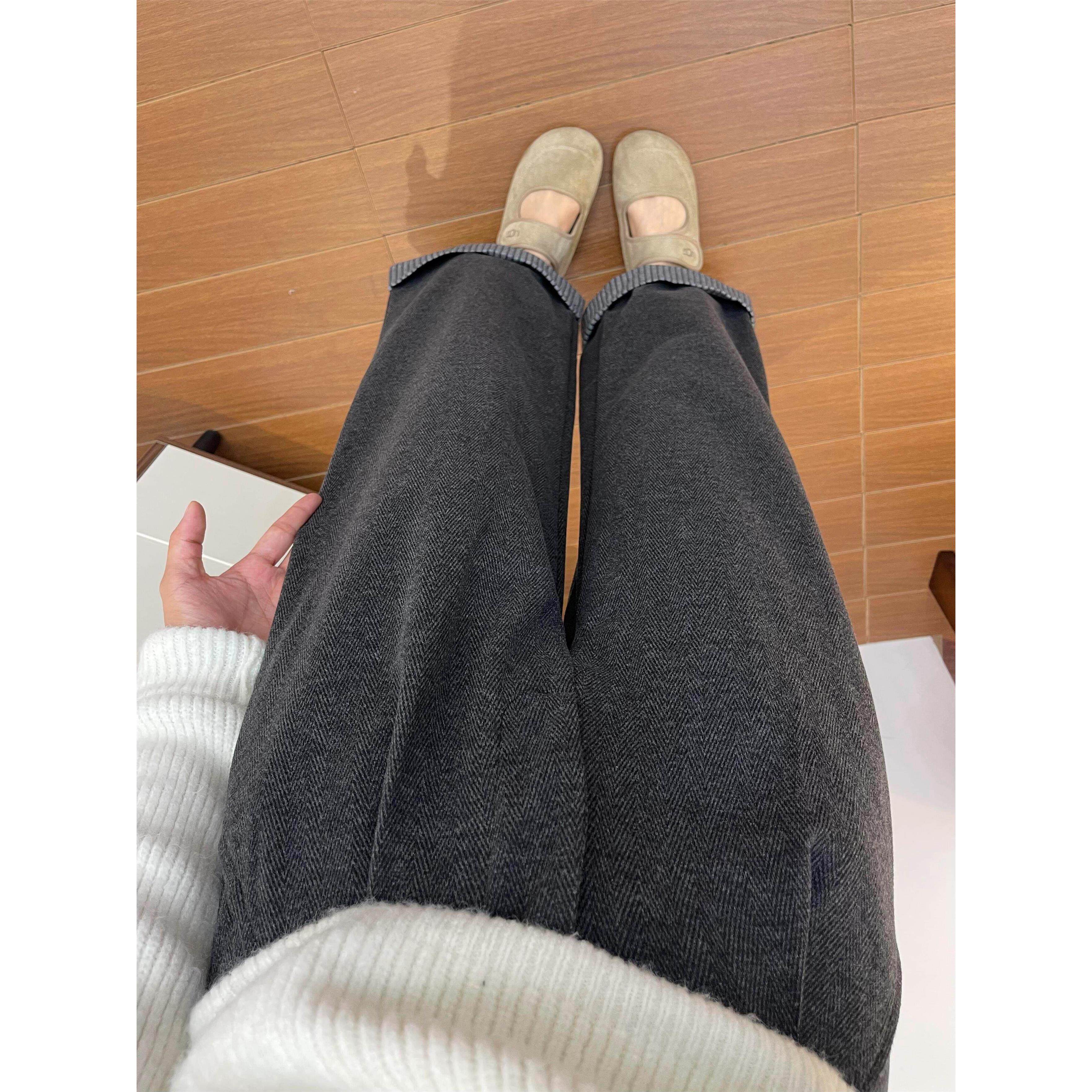 灰色毛呢休闲裤女秋冬加绒大码胖妹妹梨型身材宽松显瘦卷边阔腿裤