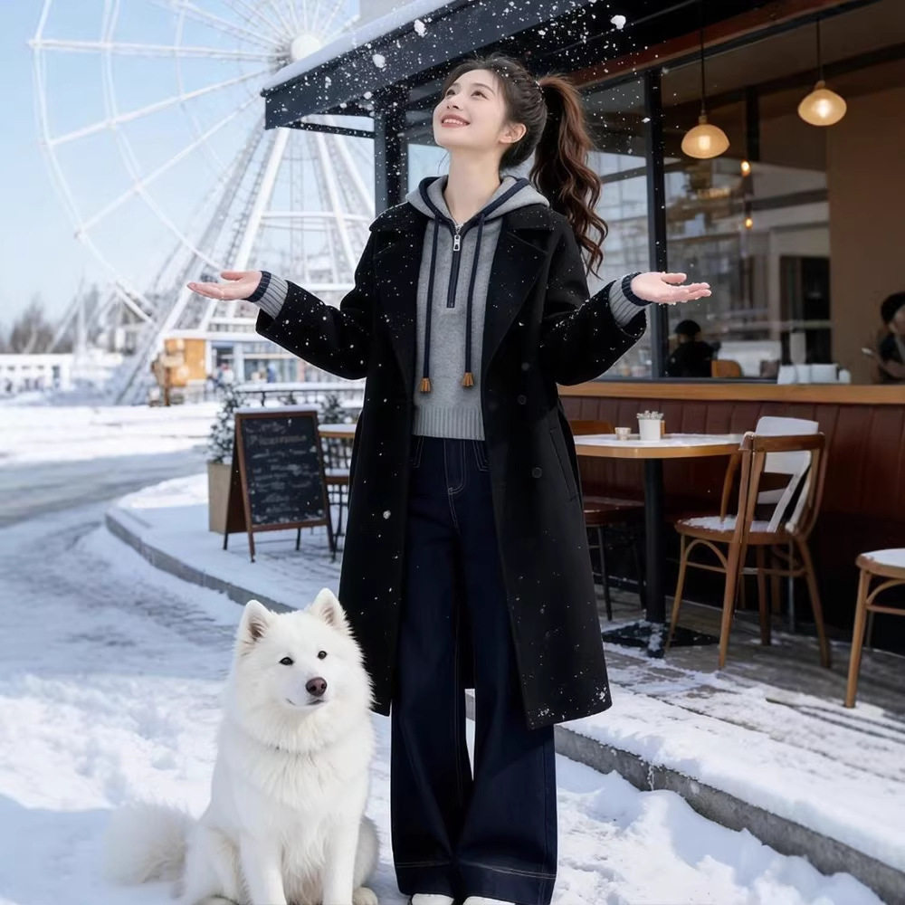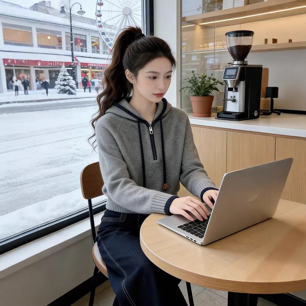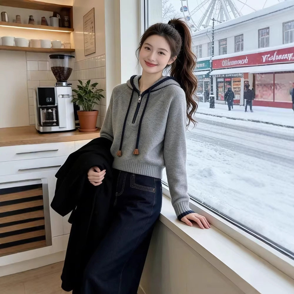 韩系灰色慵懒风气质连帽针织衫女2026年秋冬新款小个子显高上衣潮