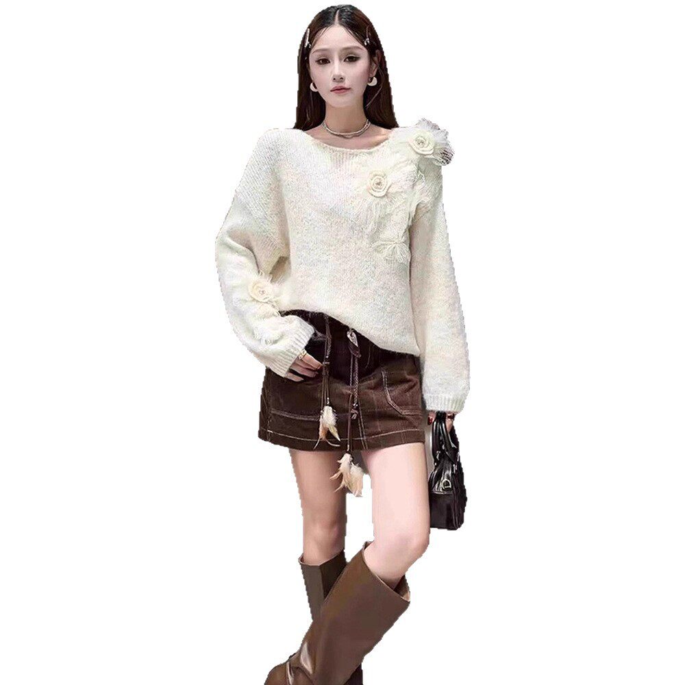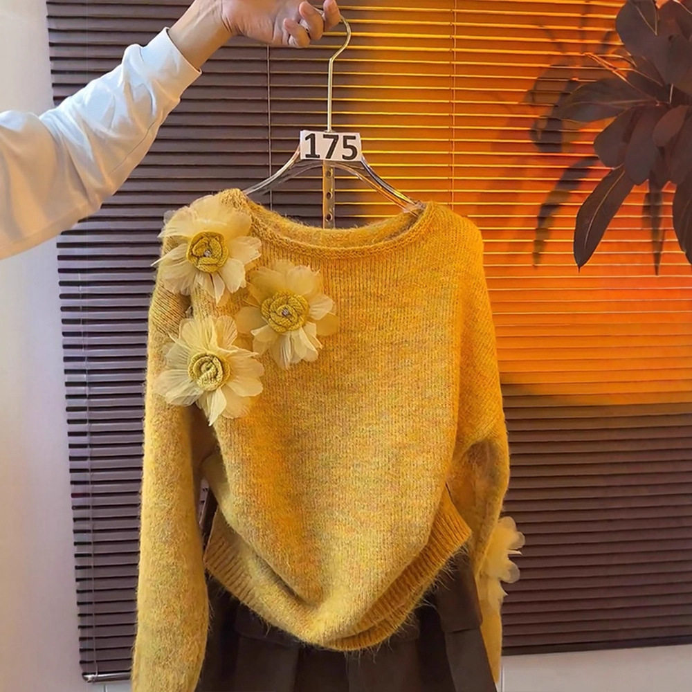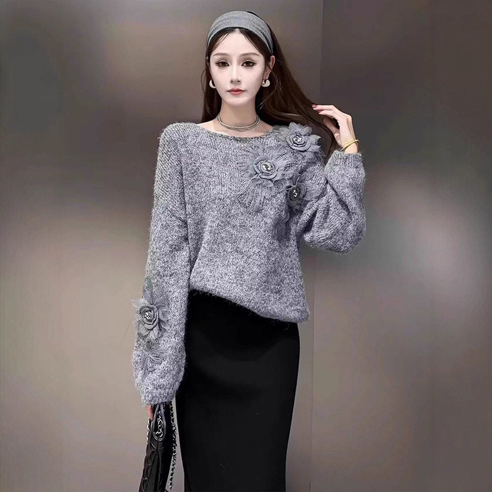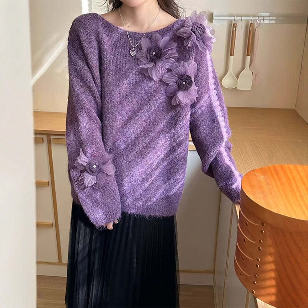 韩系慵懒风立体花朵紫色针织衫女2025秋冬新款宽松显瘦毛衣上衣潮