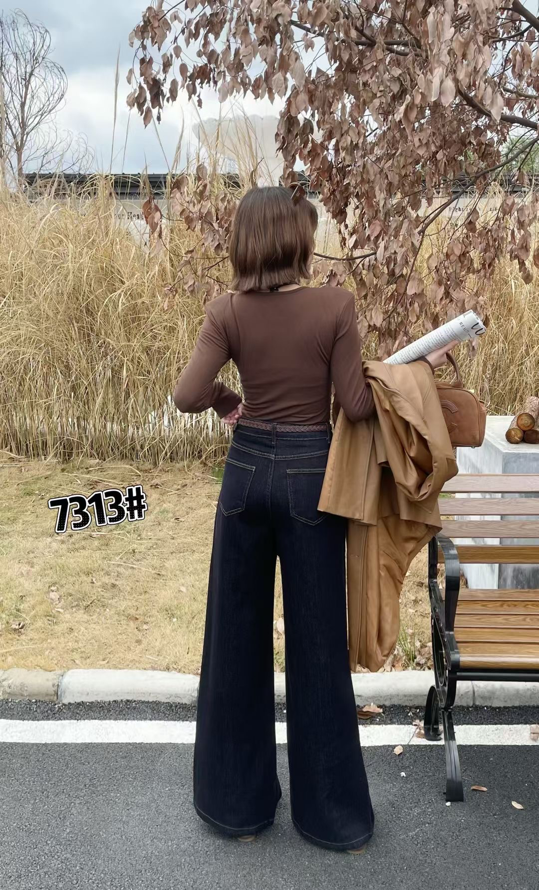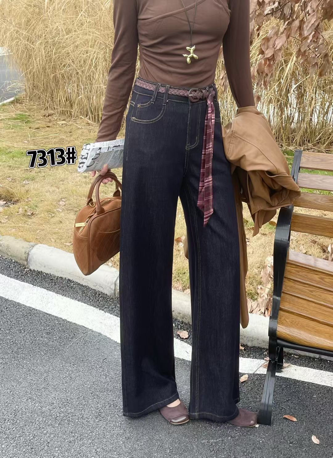 梦佳瑶7313深蓝色大裤脚牛仔裤女新款高腰宽松阔腿长裤显瘦丝腰带
