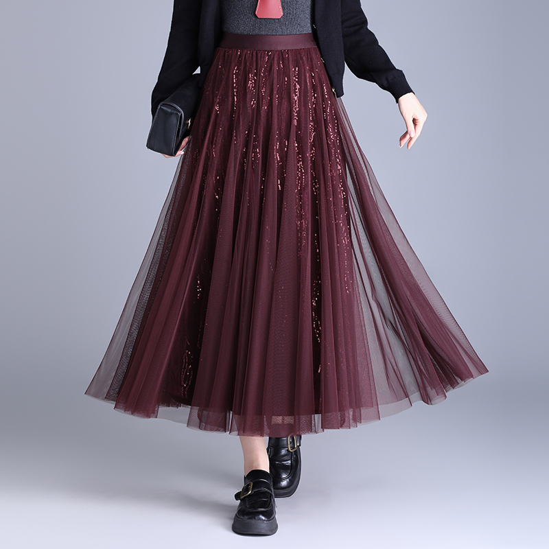亮片网纱半身裙女2025秋冬新款超仙中长款松紧腰高腰显瘦大摆裙子