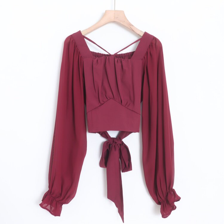 D08005日单新款交叉领后松紧显瘦女甜美气质系带短袖喇叭袖衬衫