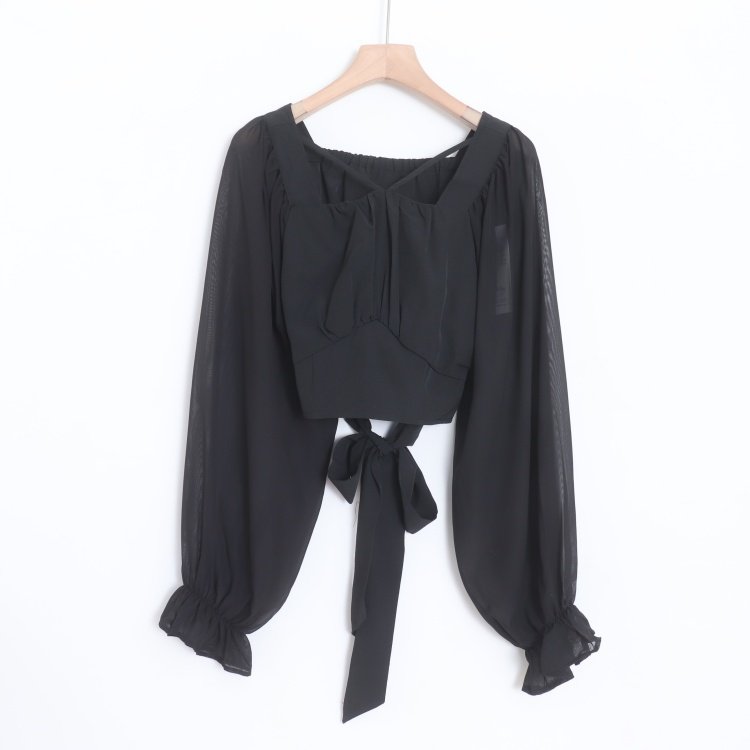 首页> 女装> D08005日单新款交叉领后松紧显瘦女甜美气质系带短袖喇叭袖衬衫