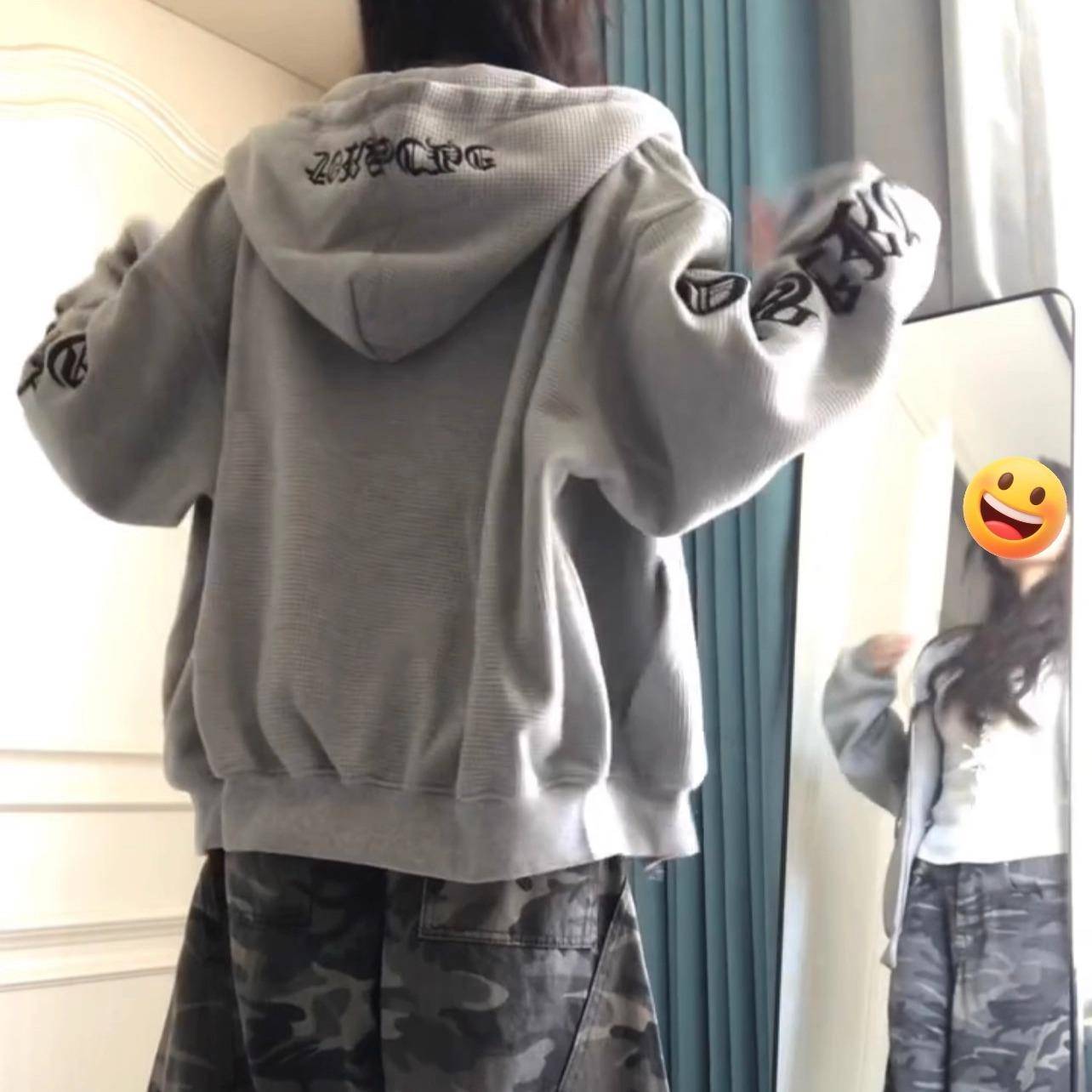美式复古潮牌刺绣连帽卫衣迷彩裤套装女春秋新款宽松亚文化穿搭
