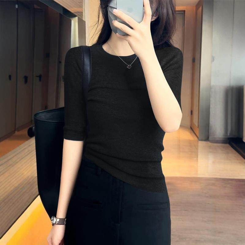 秋季新款简约圆领套头上衣女时尚修身五分袖气质百搭针织打底衫