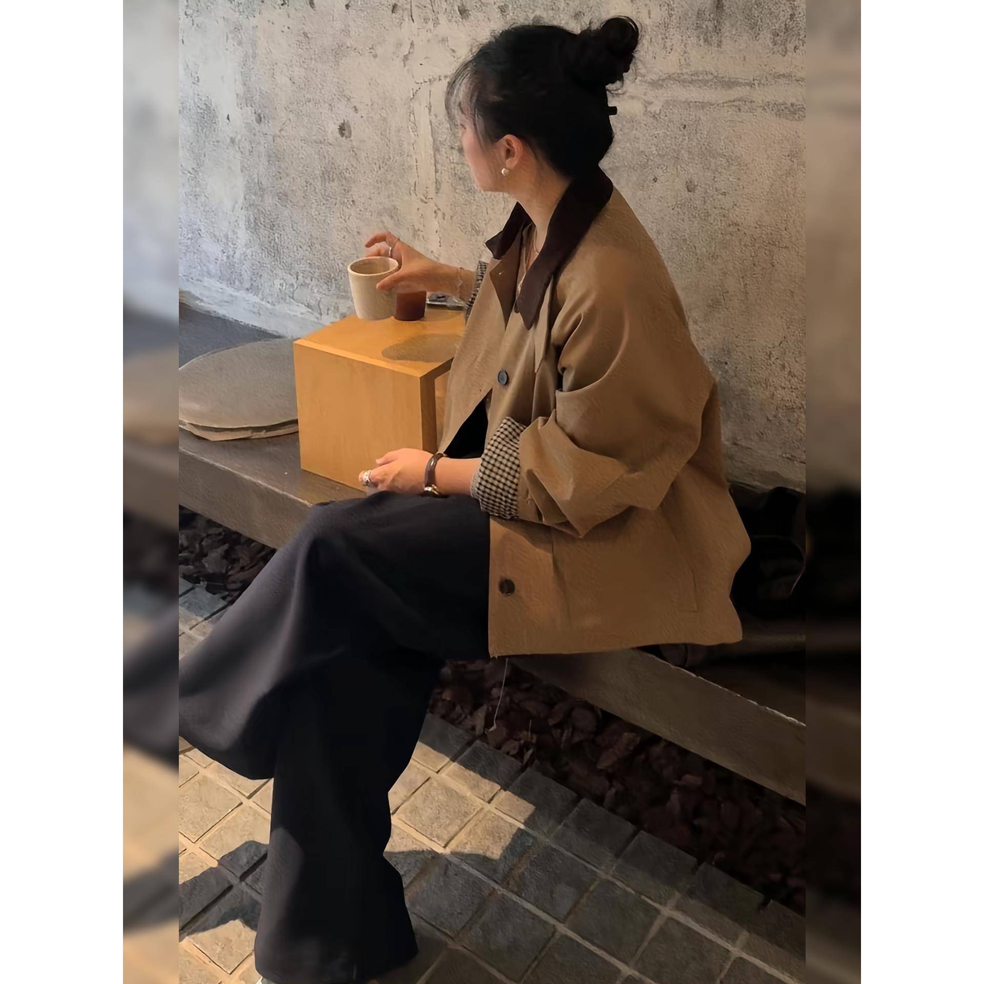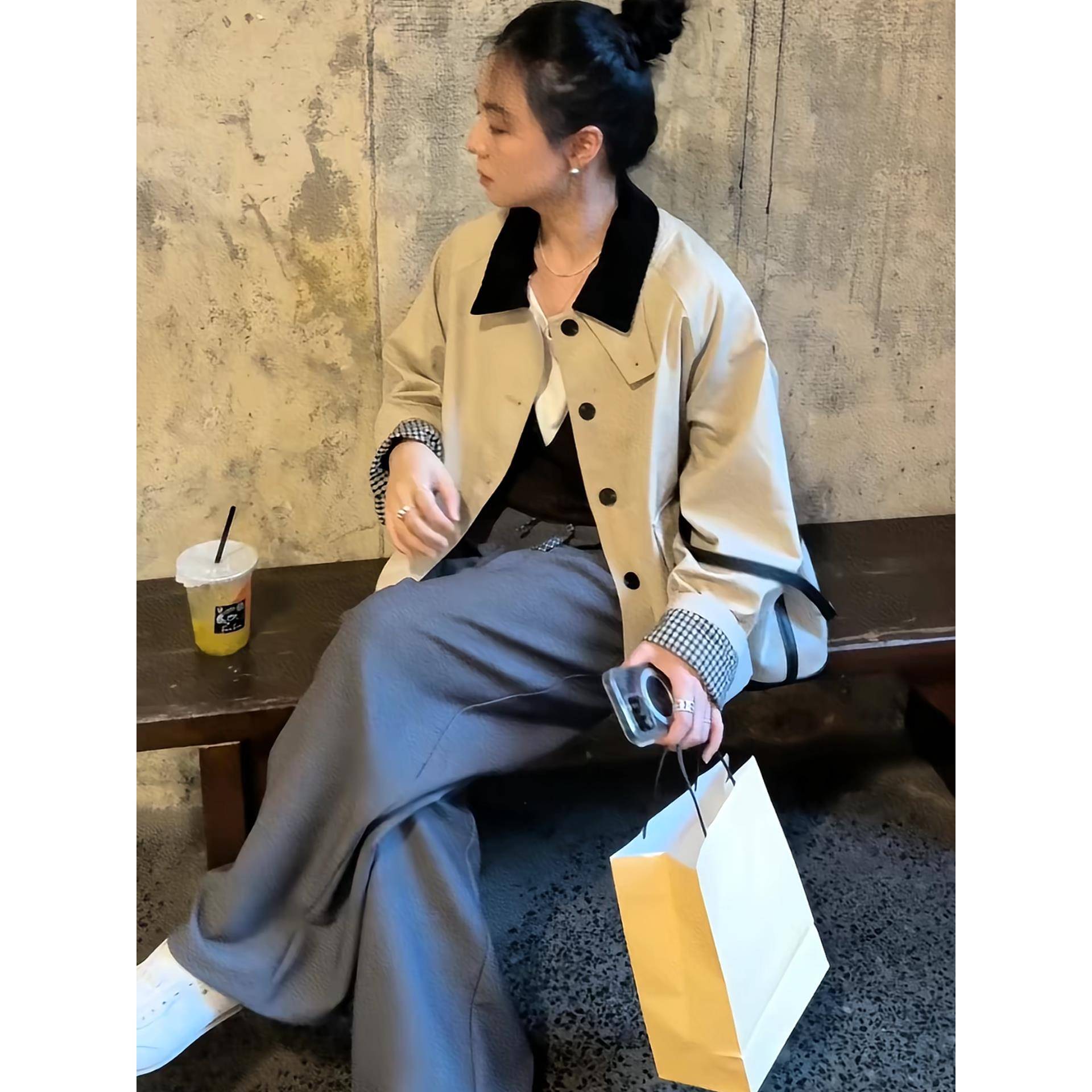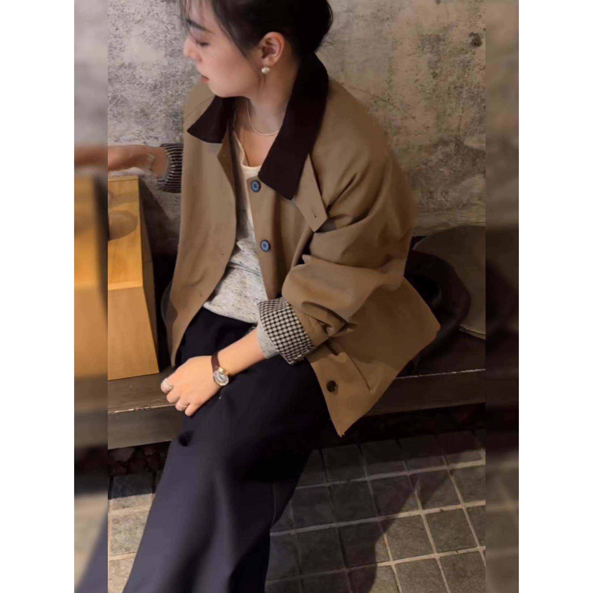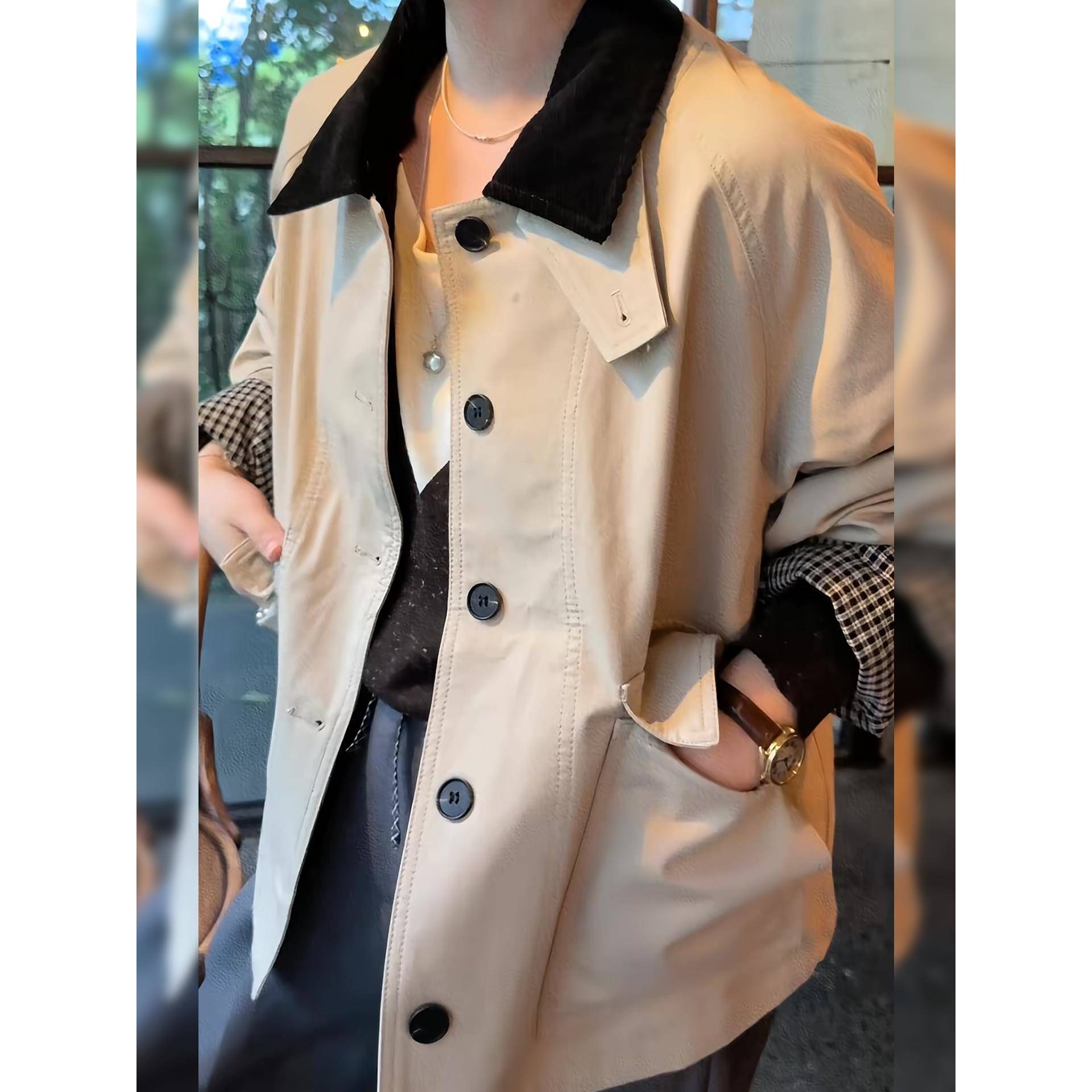 小众覆古翻领撞色工装风衣短外套女高品质宽松休闲格纹内里夹克潮