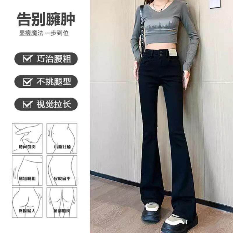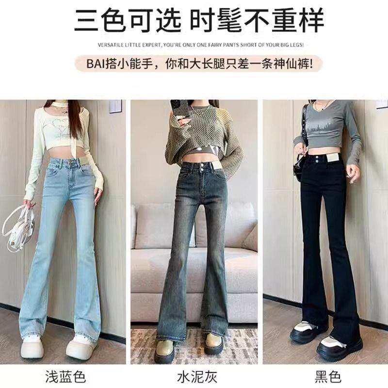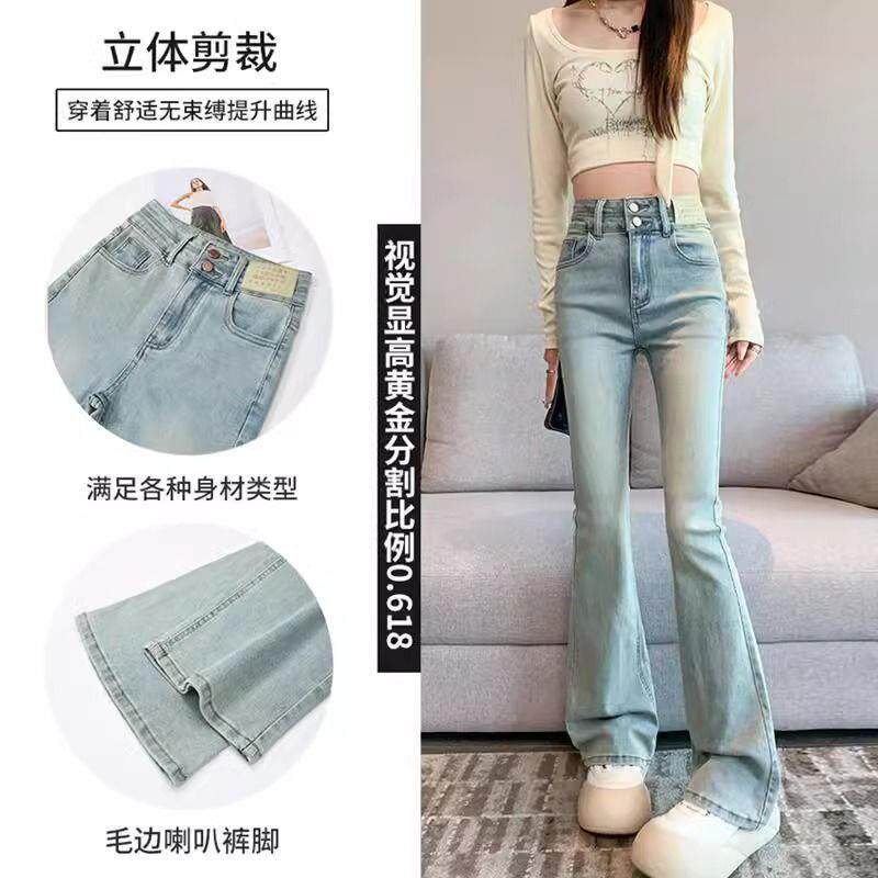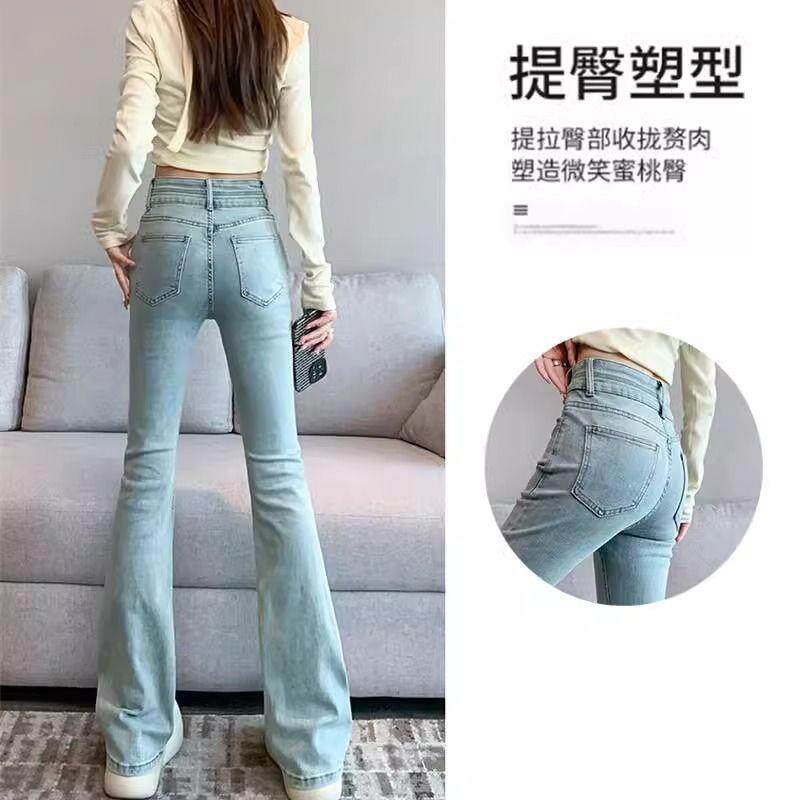 浅蓝色双扣微喇牛仔裤女小个子春秋新款高腰显瘦弹力窄版马蹄裤子