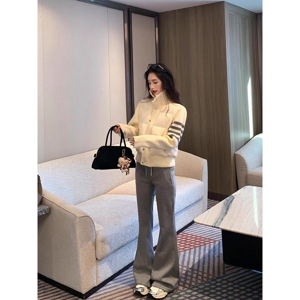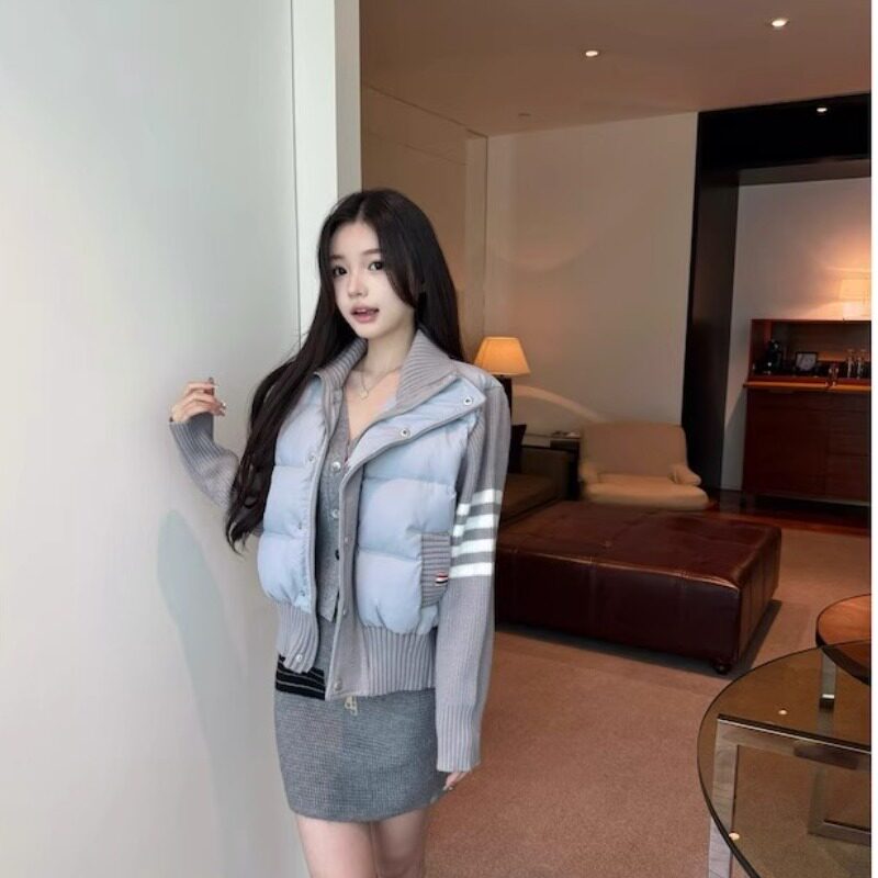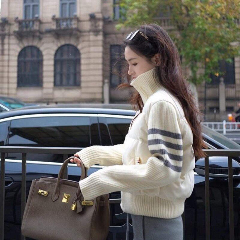 网图四条杠双色潮流韩版米白色条纹拼接棉服女冬季高级感小个子