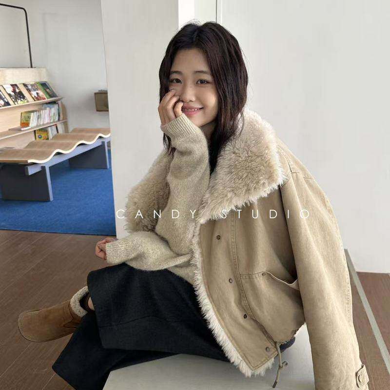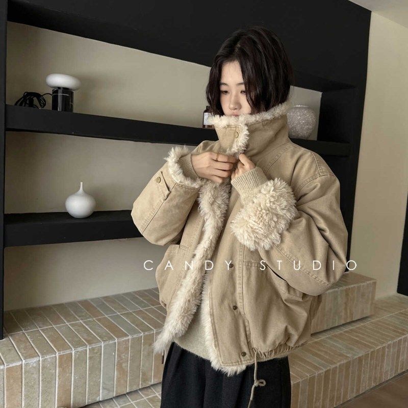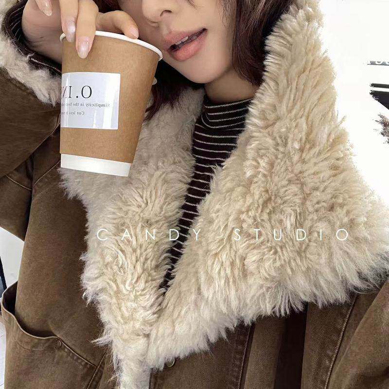 Candy糖果皮毛一体外套女冬新款复古立领宽松显瘦加绒保暖派克服