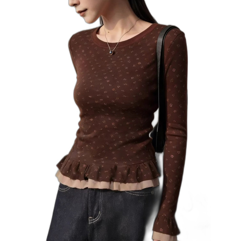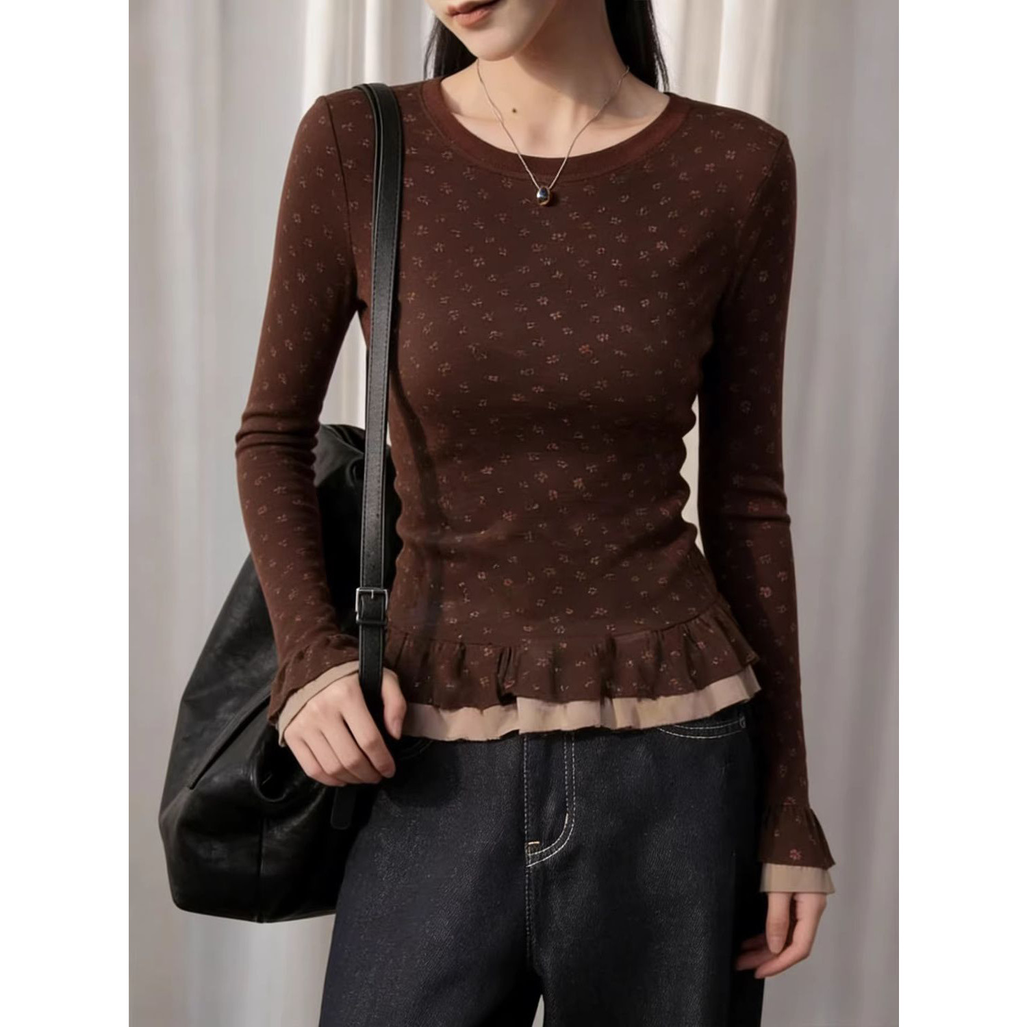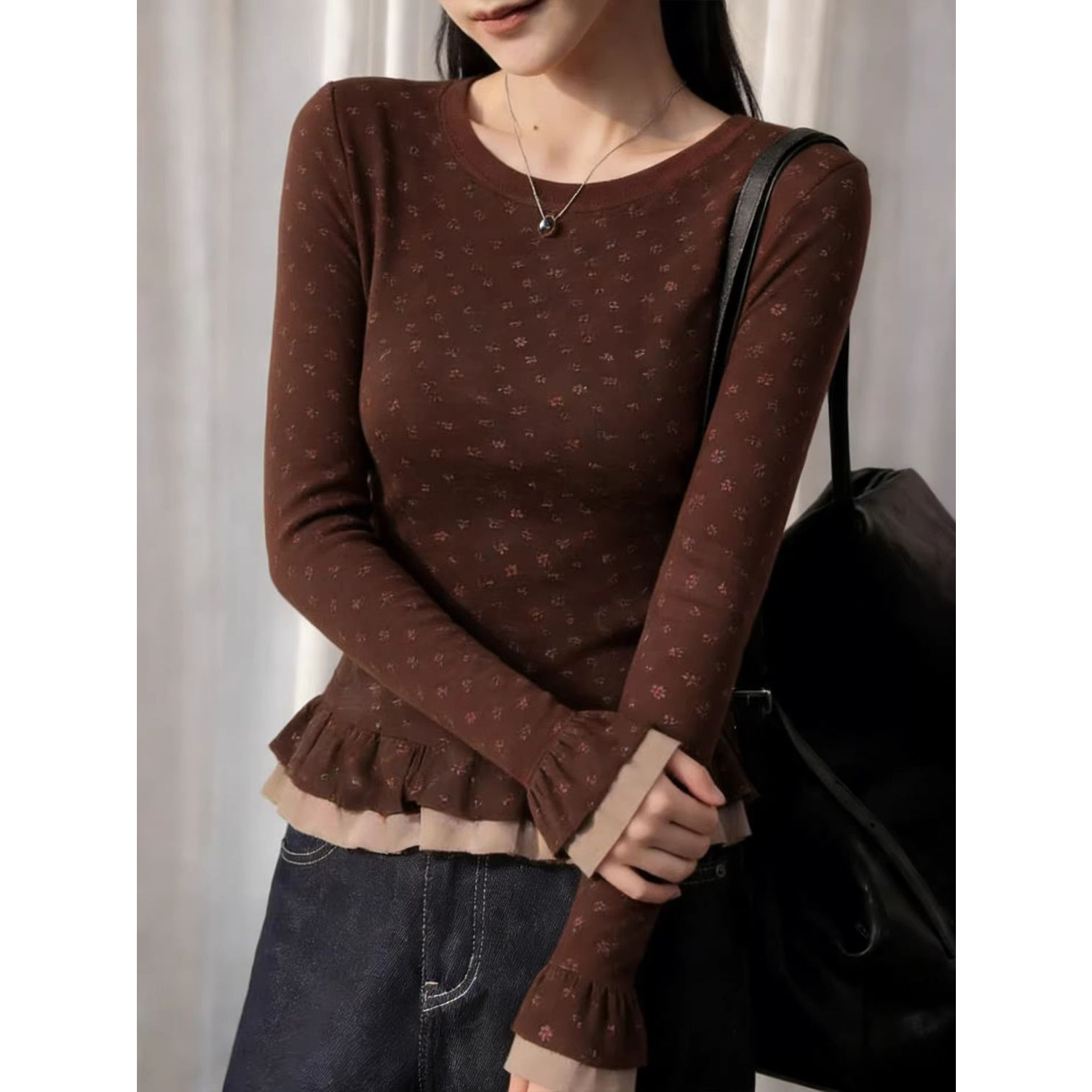 螺纹德绒喇叭袖圆领正肩长袖T恤女秋冬修身上衣