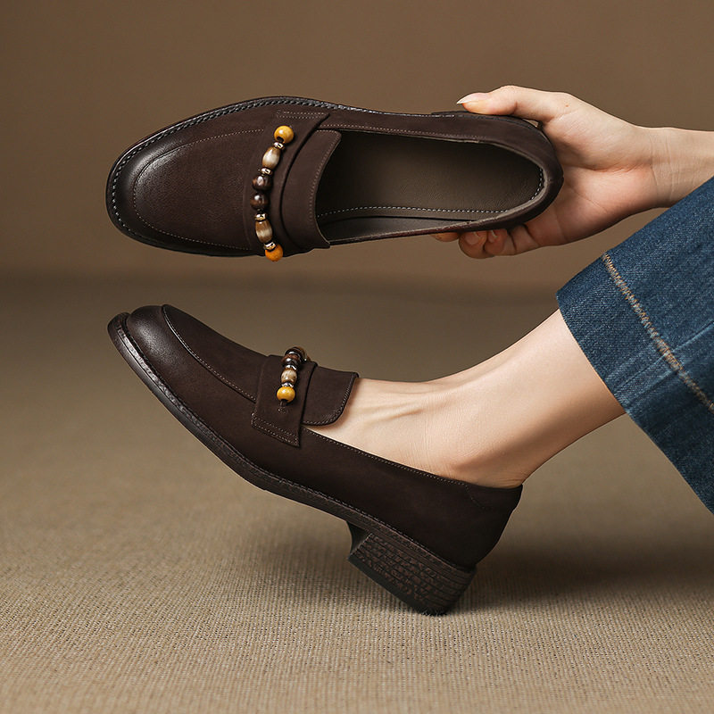 巨好看超软羊皮绝美串珠单鞋春秋款圆头粗跟乐福鞋真皮低跟女鞋子