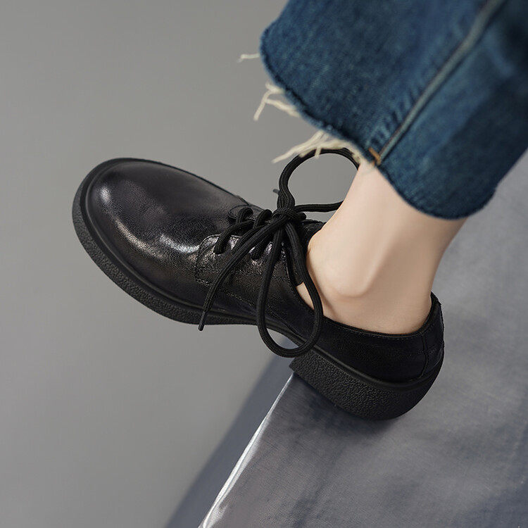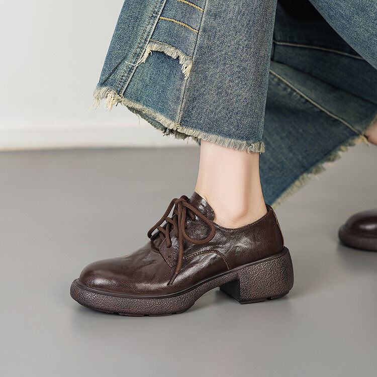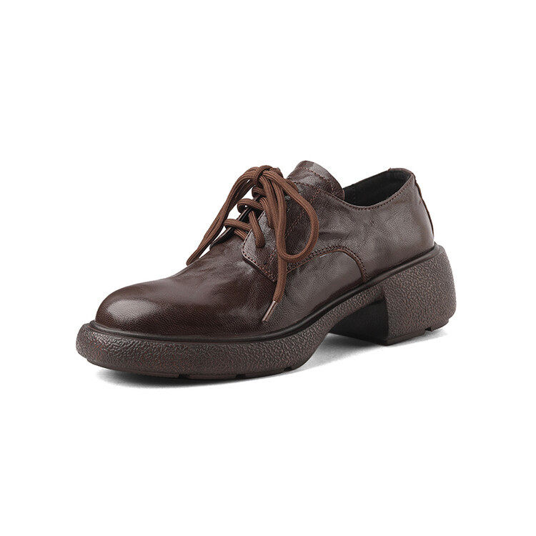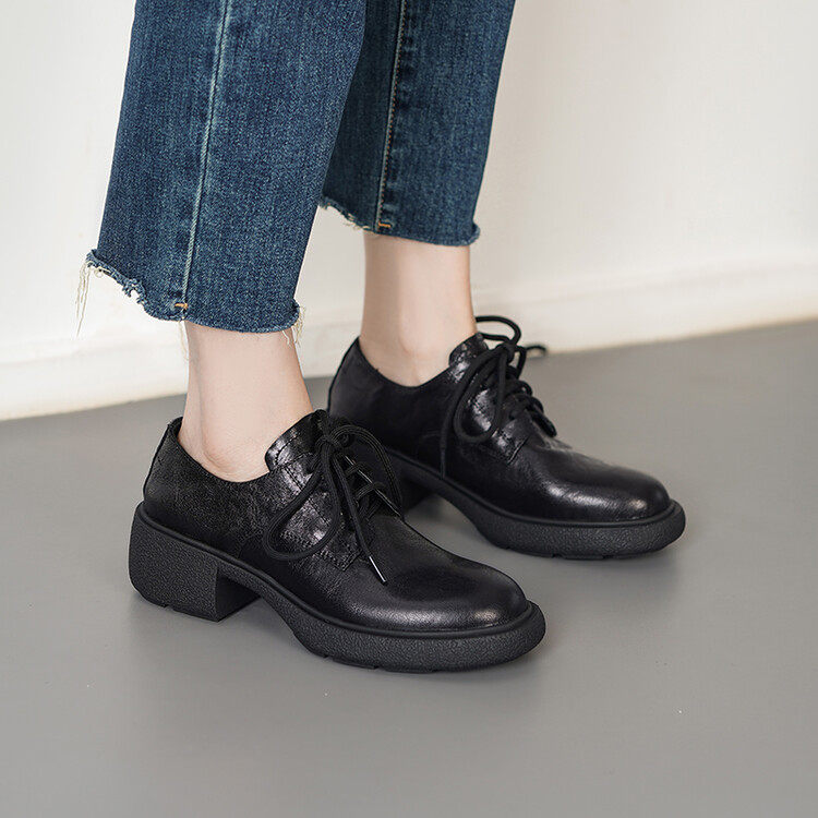 复古风粗跟小皮鞋女鞋2024年秋季新品圆头简约系带通勤中跟女单鞋