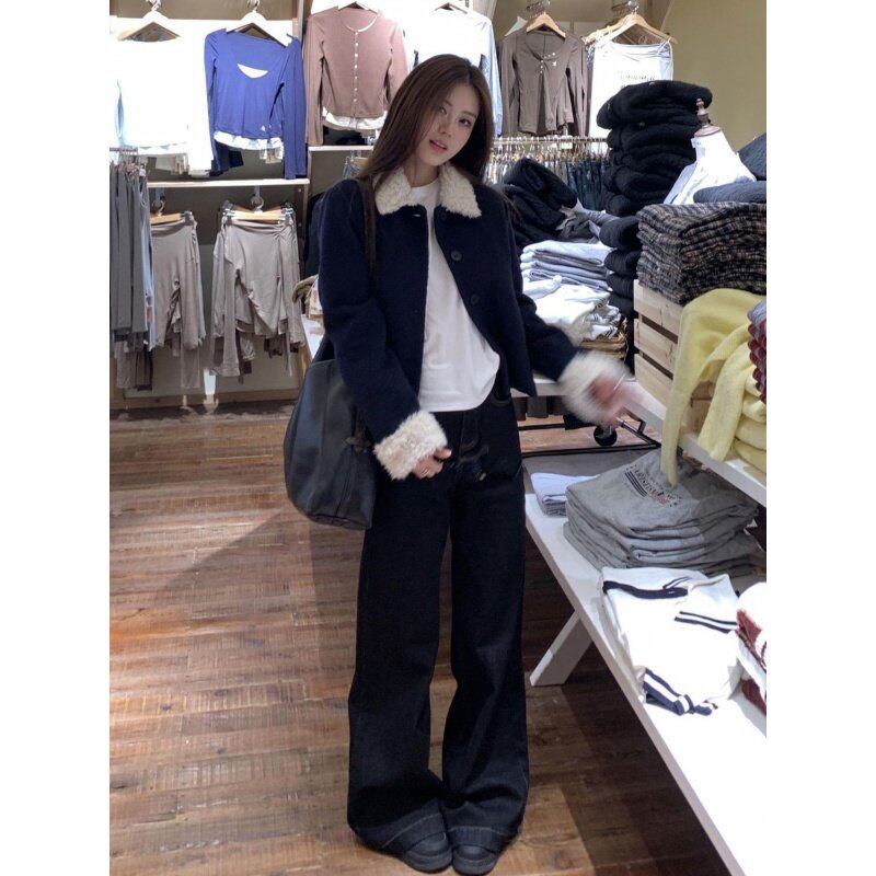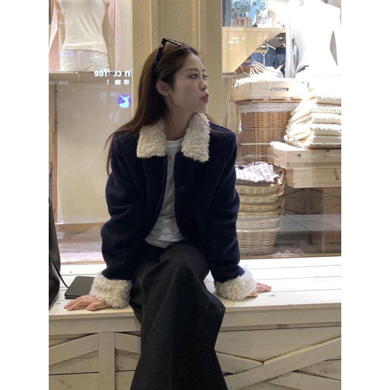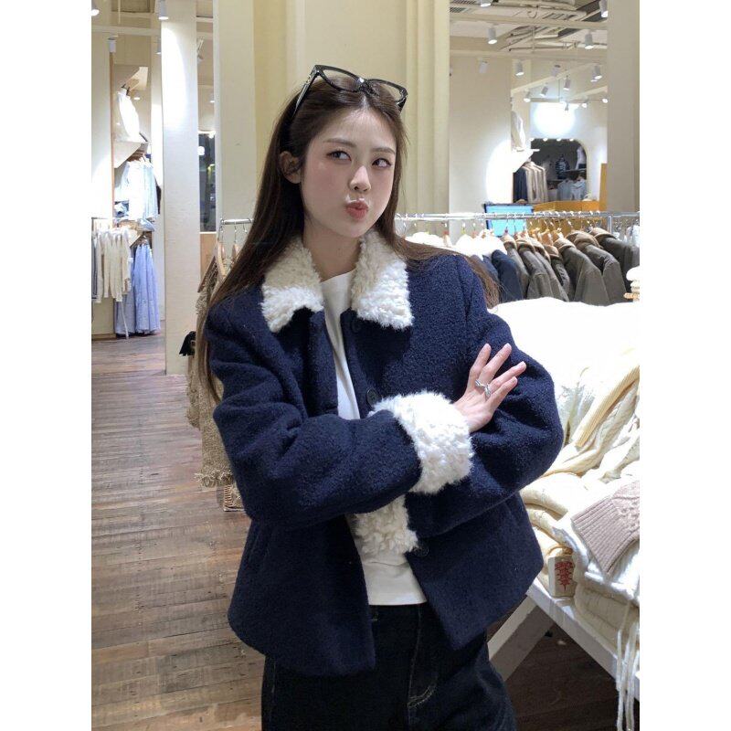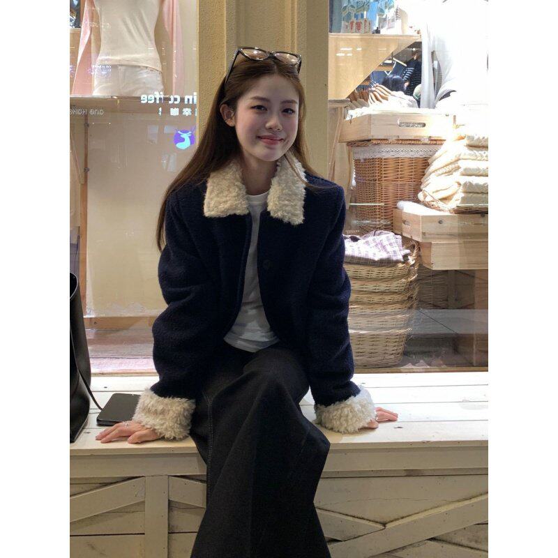 小个子减龄时尚毛呢外套女2025秋冬款藏蓝色羊羔拼接毛领短款上衣