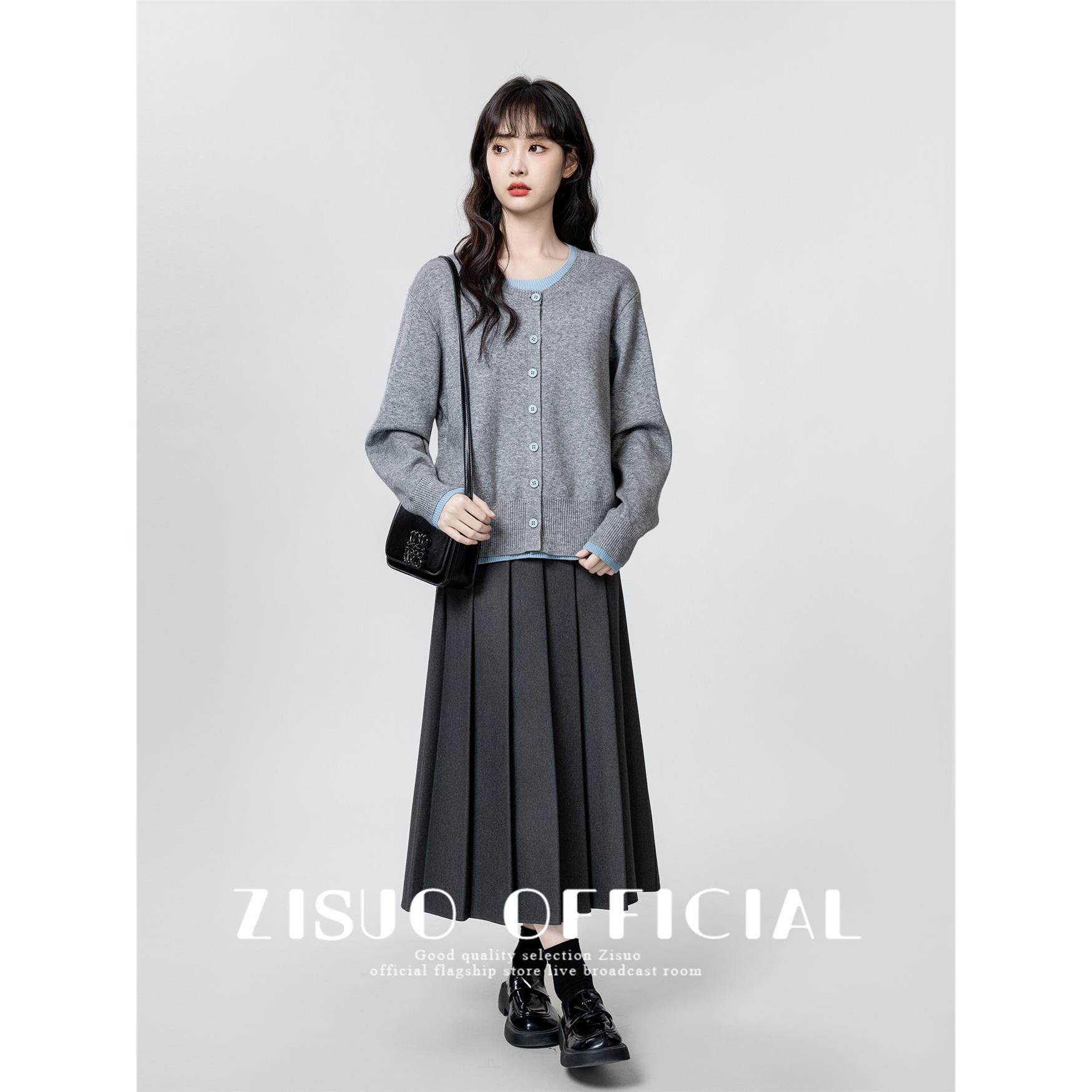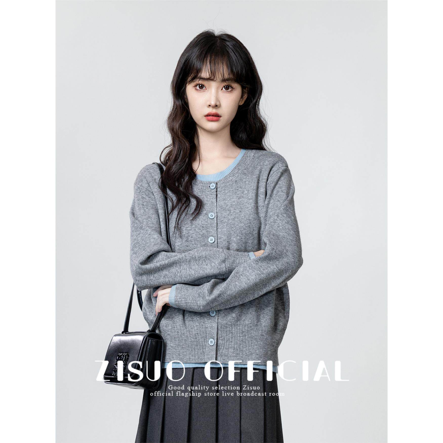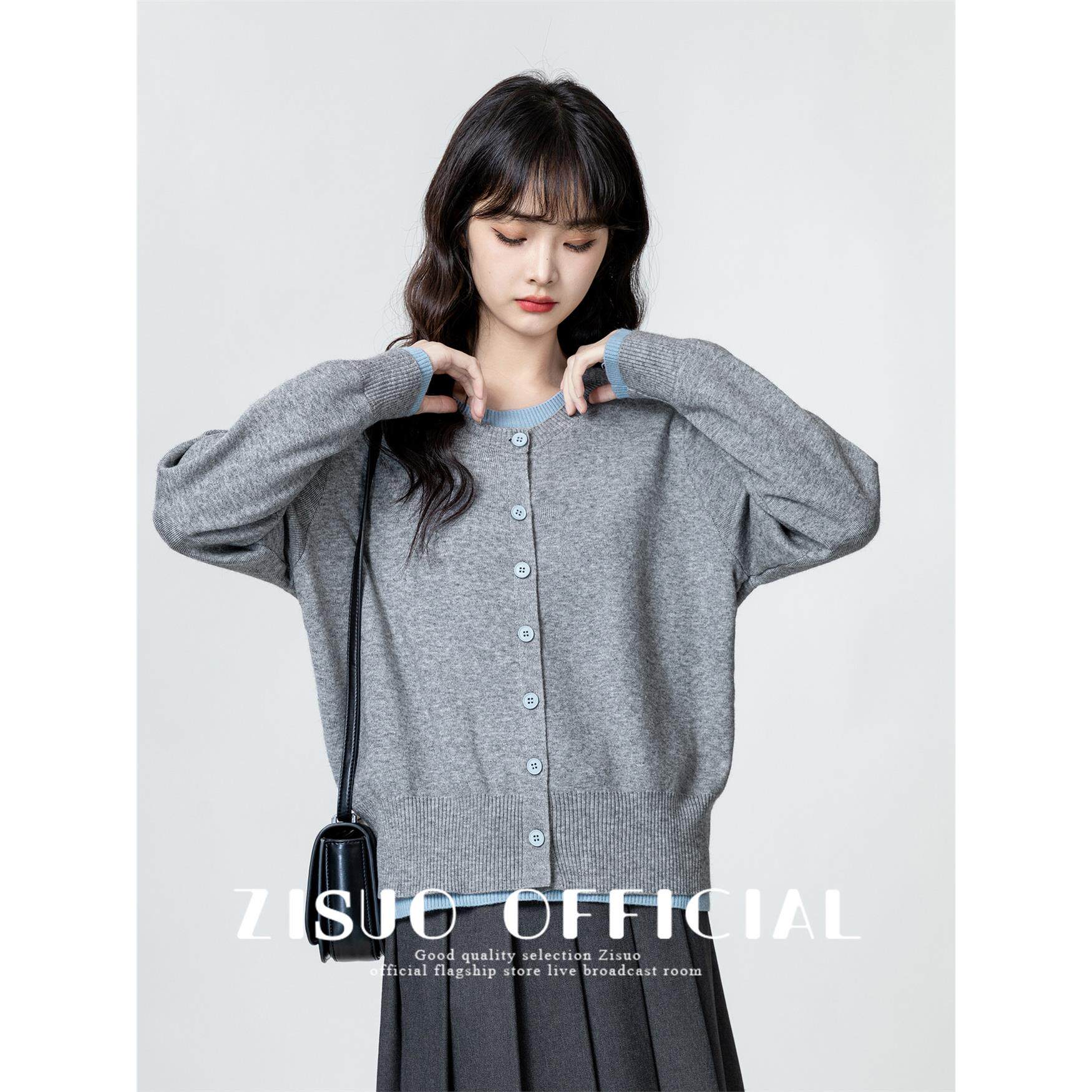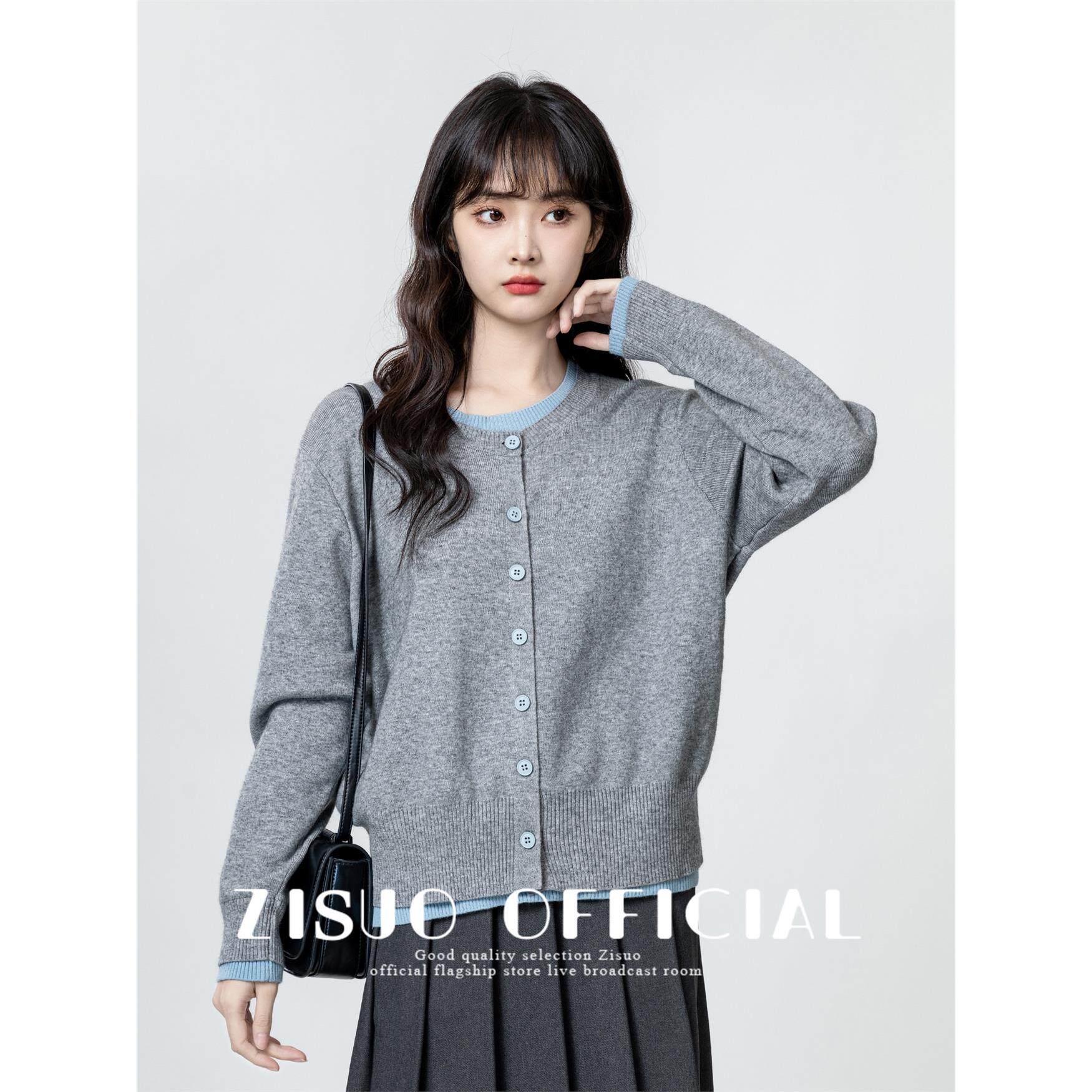 灰色假两件长袖针织衫女2025春秋新款设计感宽松撞色毛衣别致上衣