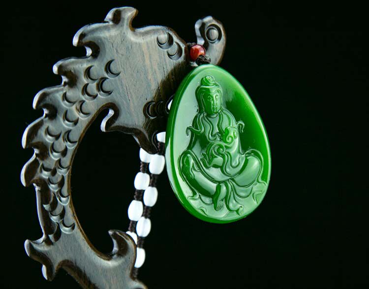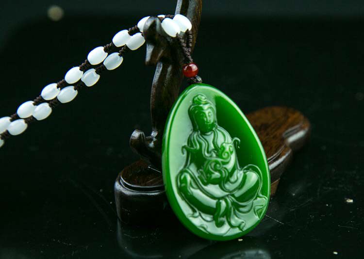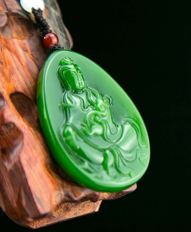天然正品新疆和田玉老坑碧玉观音挂件 菠菜绿碧玉观音吊坠玉项链