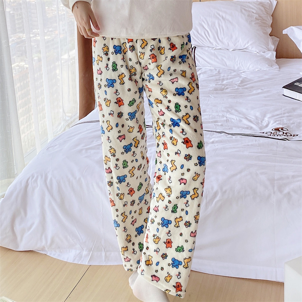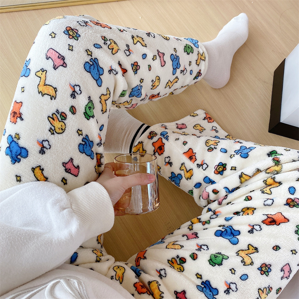 卡通动物世界法兰绒睡裤女秋冬季新款珊瑚绒加厚保暖休闲居家裤子